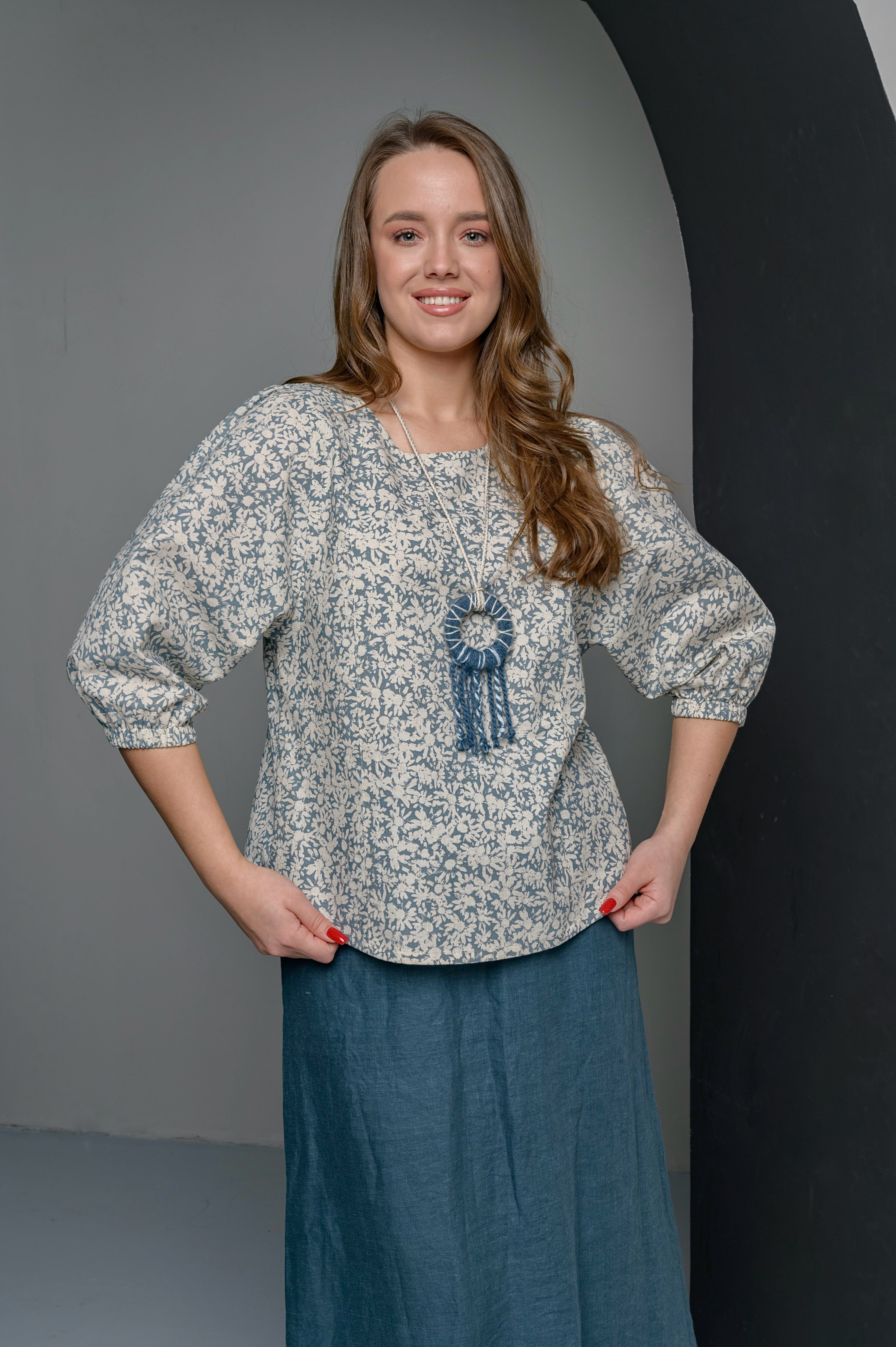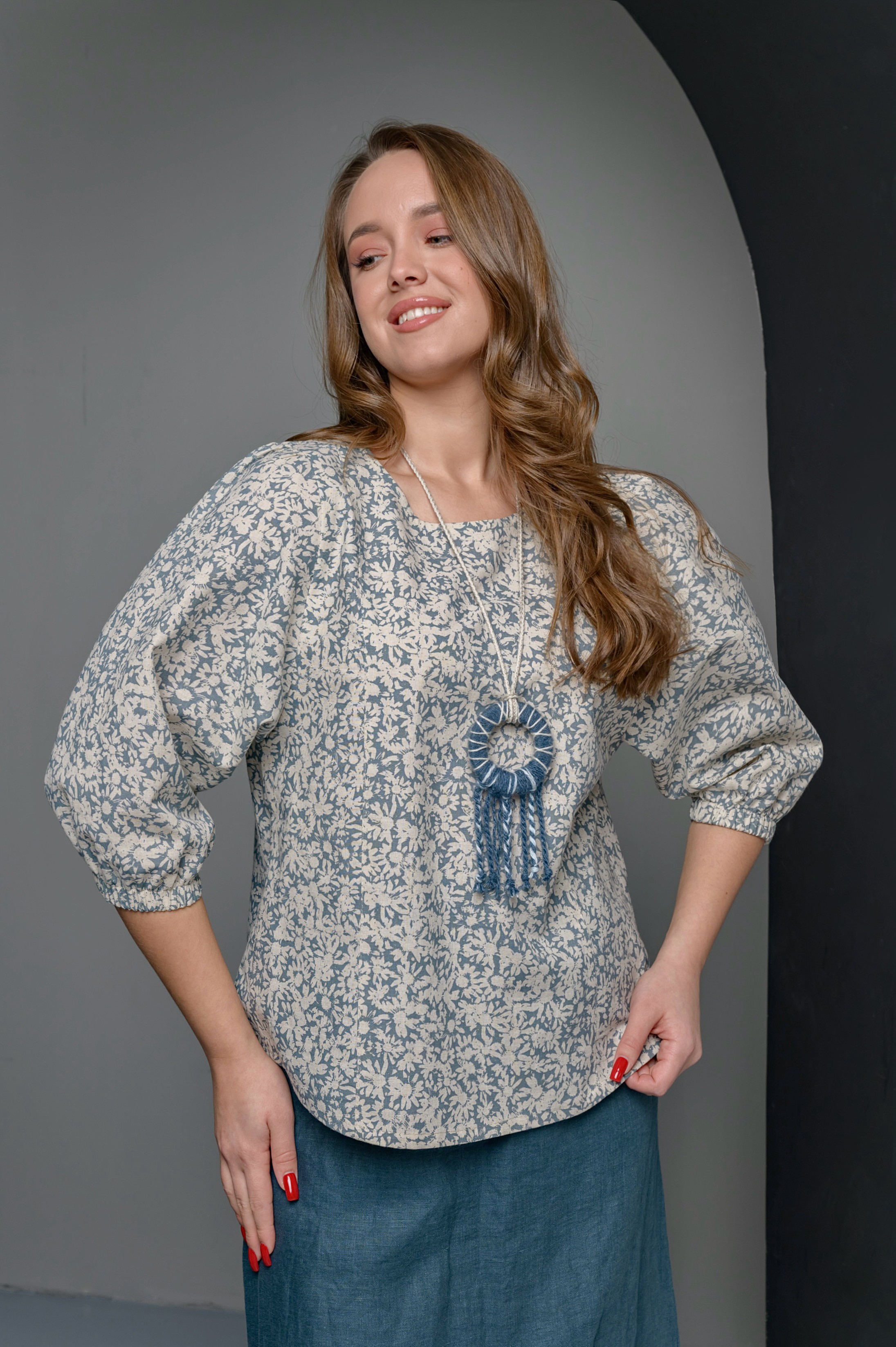 Свободная блузка из натурального материала с круглым вырезом  горловины и продольными рельефами спереди, обеспечивающими отличную посадку изделия. Углубленная пройма и пышный рукав собранный  внизу на резинку не сковывают движение, благодаря чему даже в самый жаркий день, можно будет чувствовать себя свежо и комфортно. Низ изделия плавно закруглен.