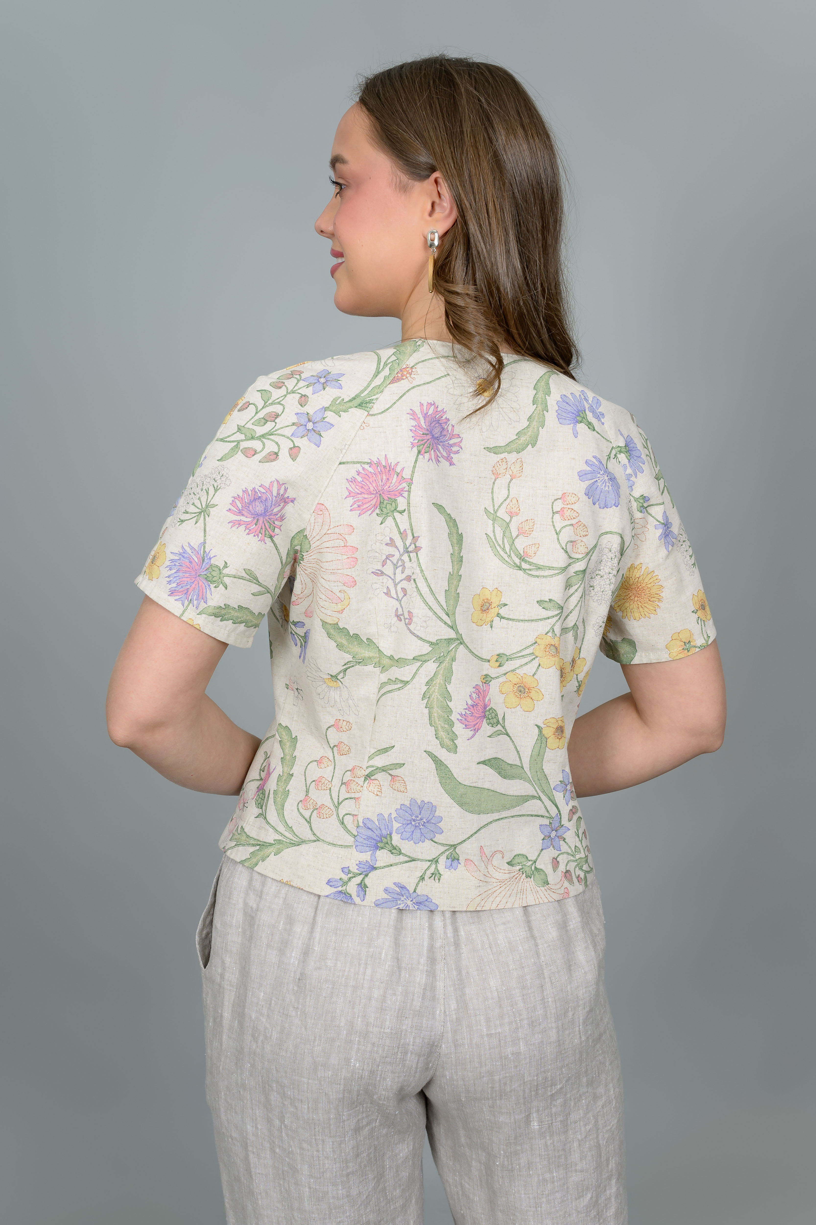 Женская укороченная блуза полуприлегающего силуэта, за счет нагрудных и талиевых  вытачек,  короткий рукав покроя реглан обеспечивает свободу движений и отлично подходит для жарких летних дней, вырез горловины переда V-образной формы, длина изделия выше линии бедер.