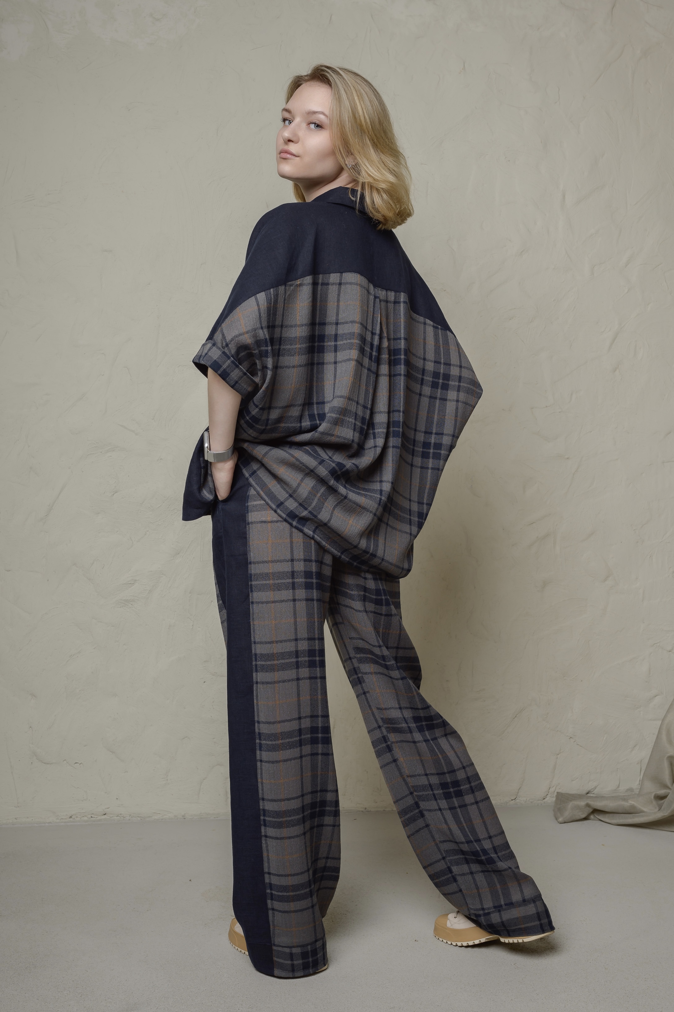 Летняя льняная блуза «оверсайз».  Эффектная крупная клетка (100% вискоза) дополненная однотонным темно/синим компаньоном (100% лен),  делает изделие оригинальным и стильным.  Свободный крой с цельнокроеной формой рукава делает вещь универсальной для фигур большой полноты. Вискозная ткань в клетку придает воздушность образу, обеспечивает дополнительное «проветривание», но исключает просвечивание в области тела. Лен отлично впитывет влагу, обеспечивая комфорт в теплый и жаркий период.
