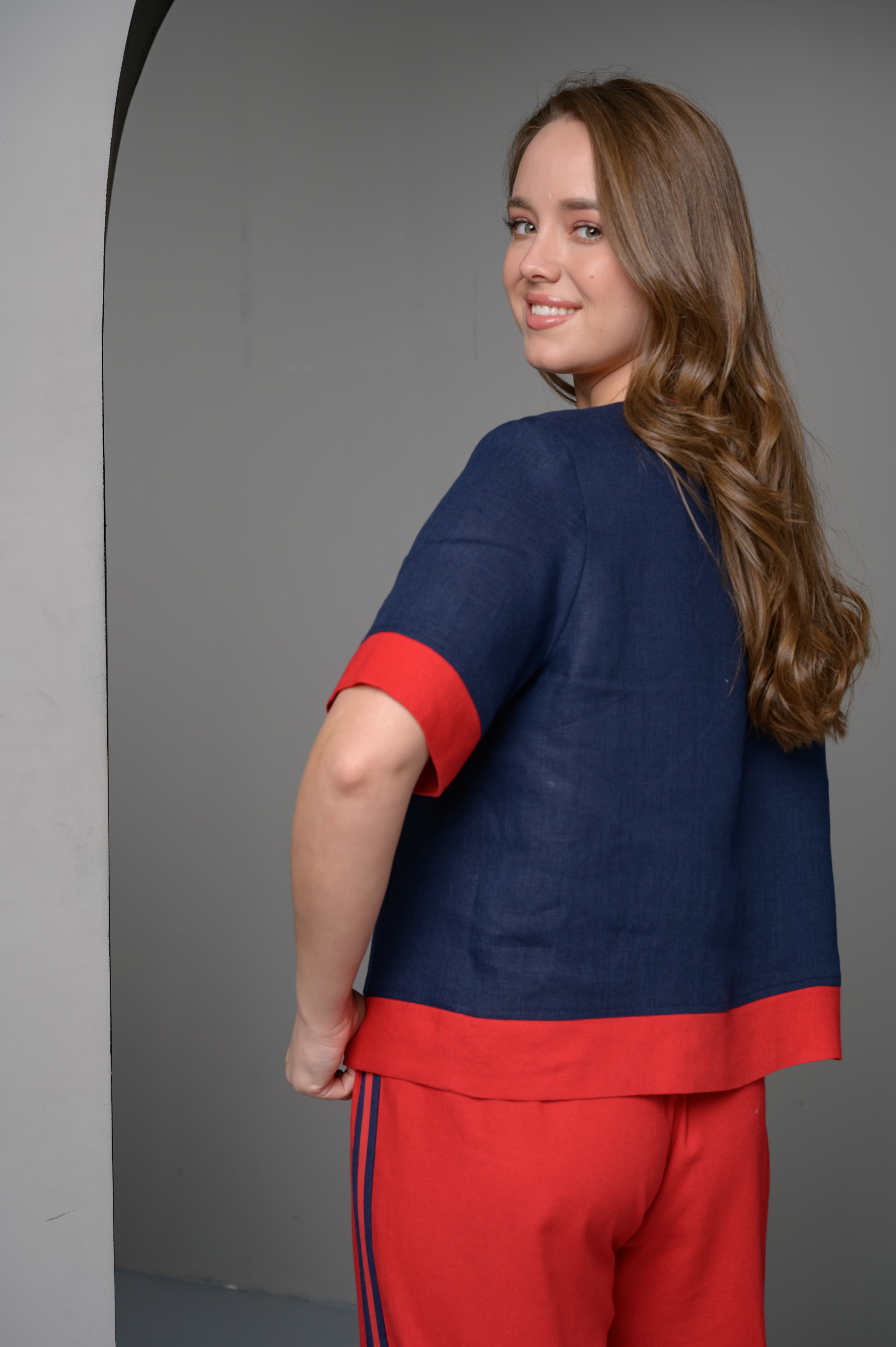 Льняная базовая блуза свободного силуэта. Предлагается в комплекте с брюками арт. 076, а также может использоваться как отдельный предмет гардероба.