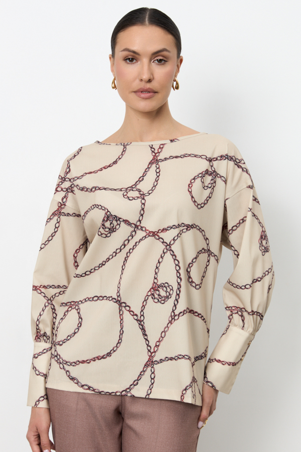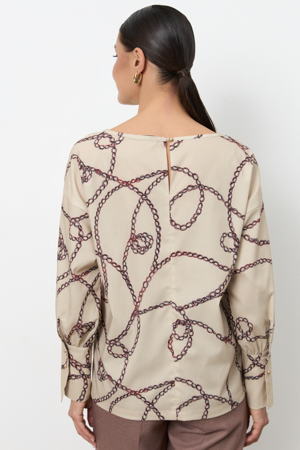 Блуза свободного силуэта из вискозной ткани. Втачной рукав на высокой манжете с застёжкой на пуговицы. Круглый вырез горловины обработан косой бейкой. По среднему шву спинки застёжка на петлю-пуговицу.