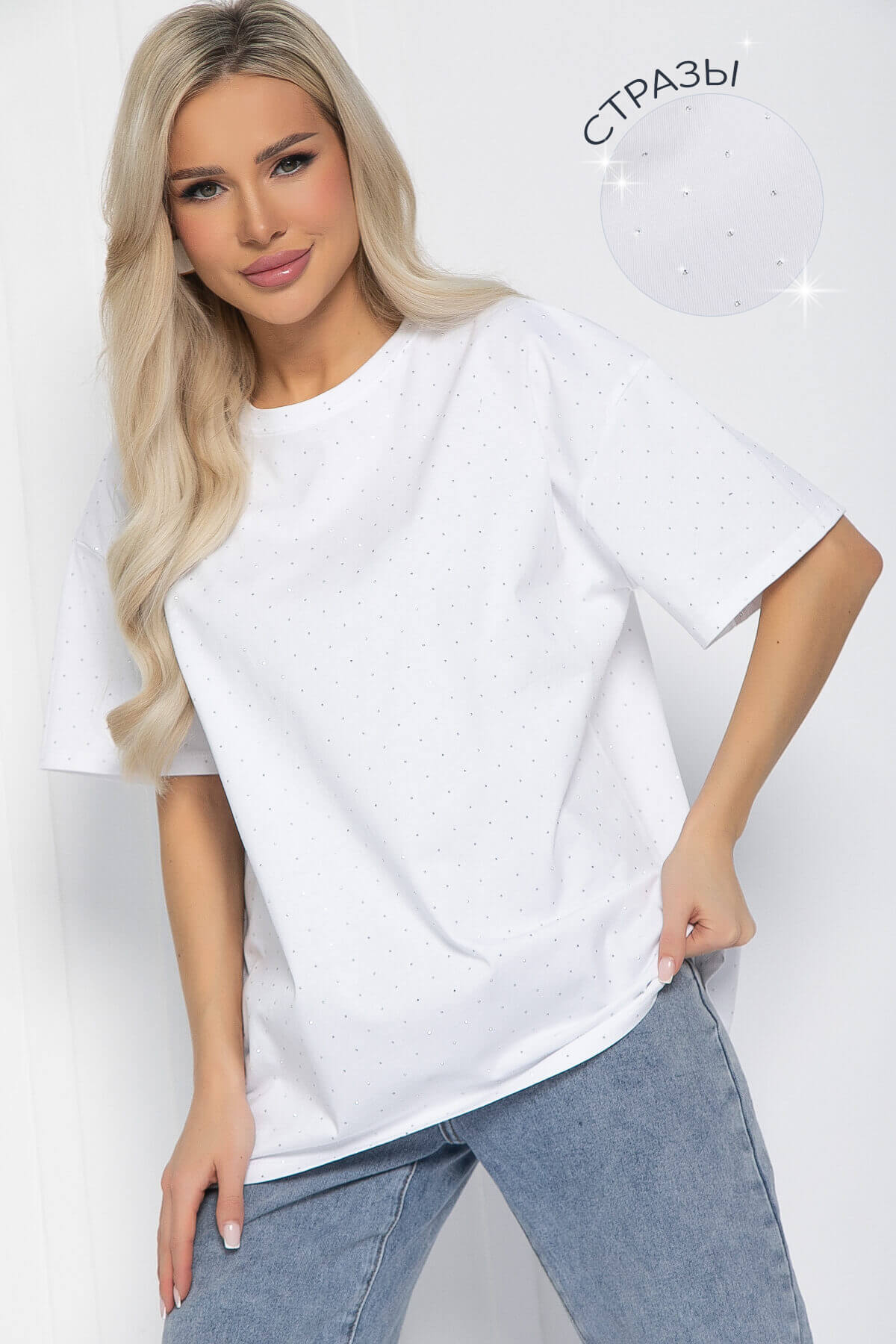 Футболка со стразами в классическом белом цвете — это идеальный выбор для тех, кто хочет разнообразить свои повседневные образы. Она гармонично сочетается с любой одеждой, что делает её универсальной и незаменимой в вашем гардеробе. Эта футболка выполнена из мягкой и приятной на ощупь ткани с хлопком в составе. Она имеет свободный прямой крой, округлый вырез горловины и короткие рукава, что обеспечивает комфорт и стиль в любой ситуации.