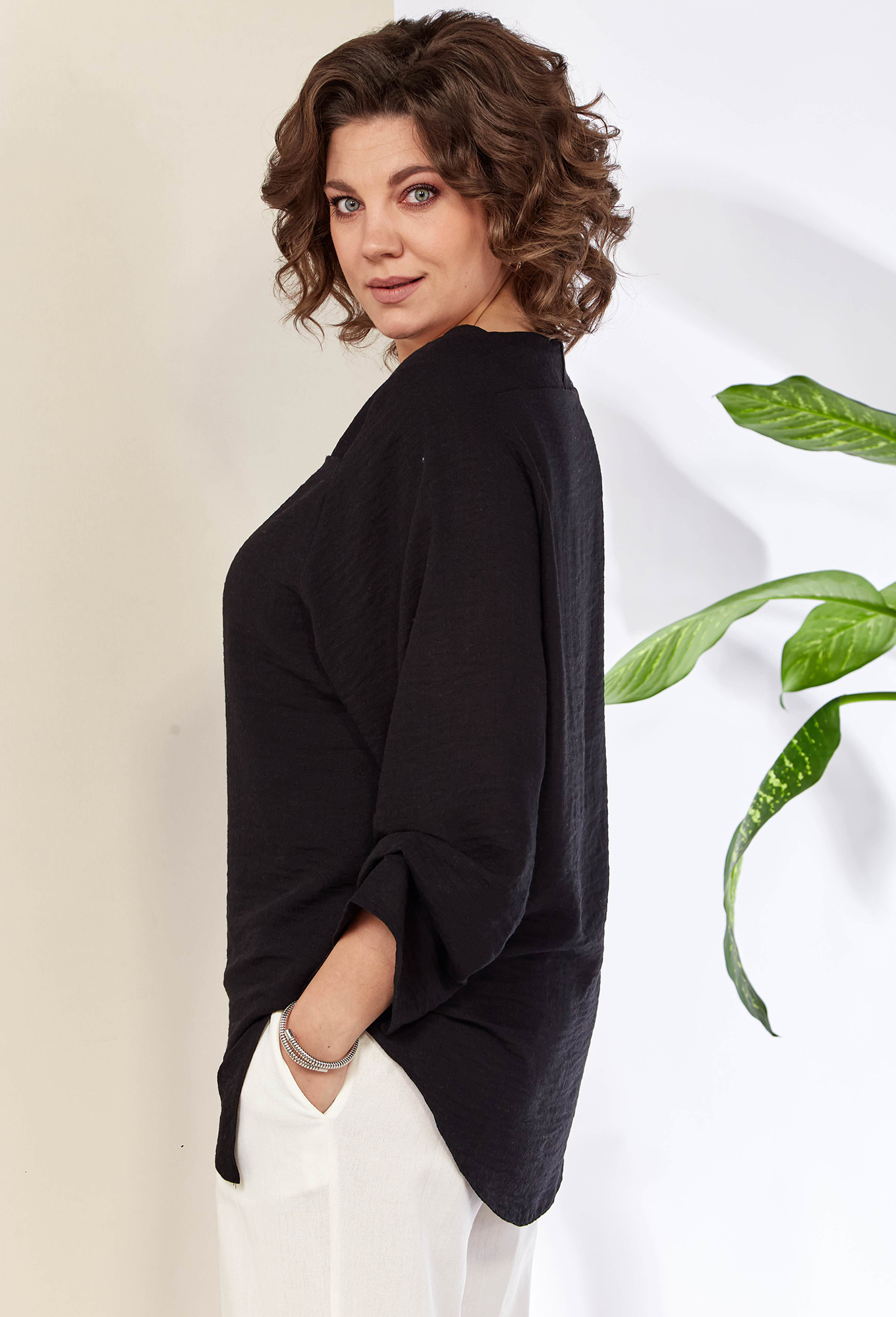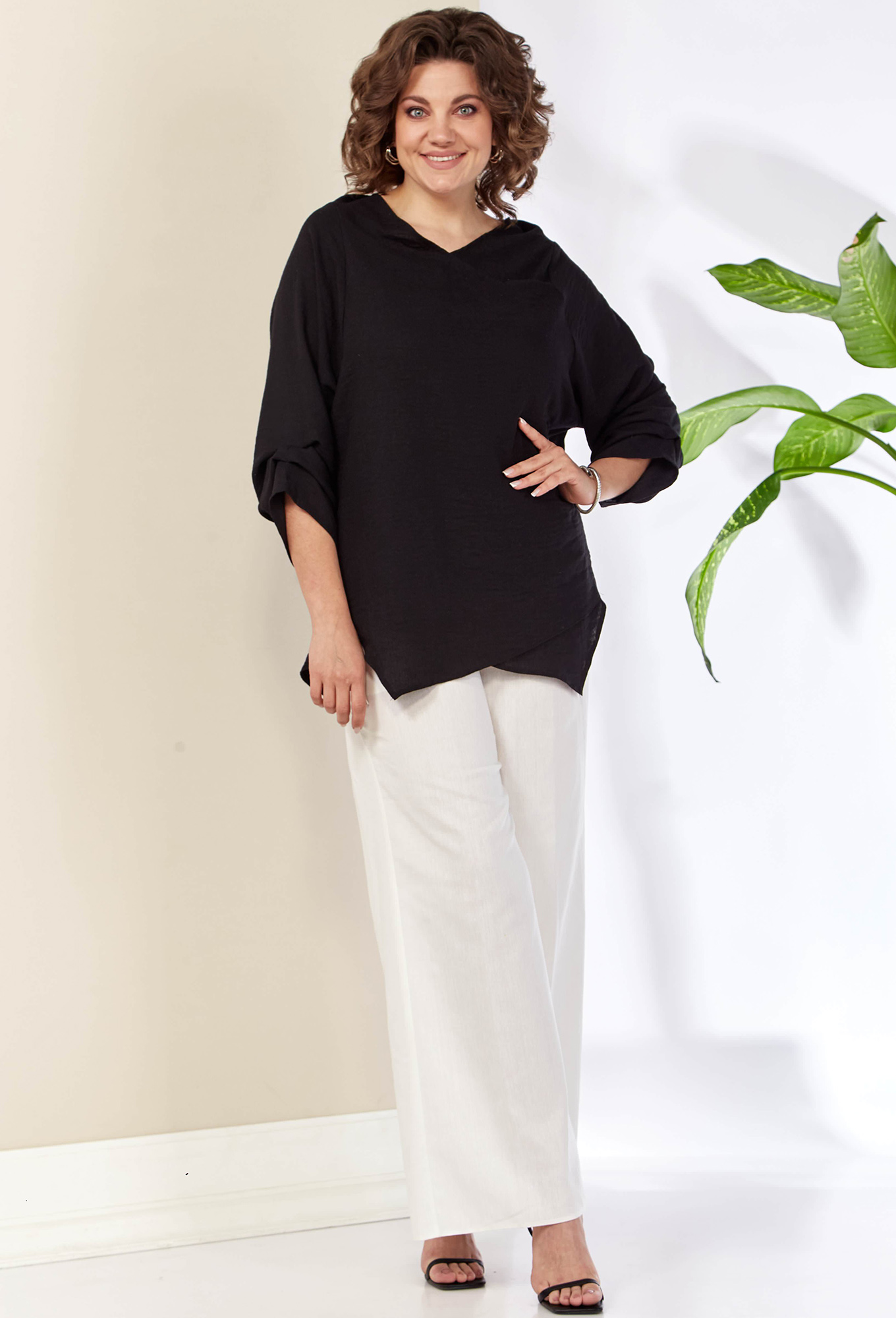 Модель: Анастасия 1115 черный Рос..показатьт: 164 см (девушка на фото ростом 170см) Сезон: Весна-Лето Тип ткани: Полиэстер 75%, Лен 15%, Хлопок 10%Блузка женская из текстильной ткани. Модель прямого силуэта, рукав углублённый , рубашечного типа. Перед идет с запахом, низ блузы ассиметричный, по полочке углы, спинка закруглённая, удлинённая. По рукаву идут защипы.