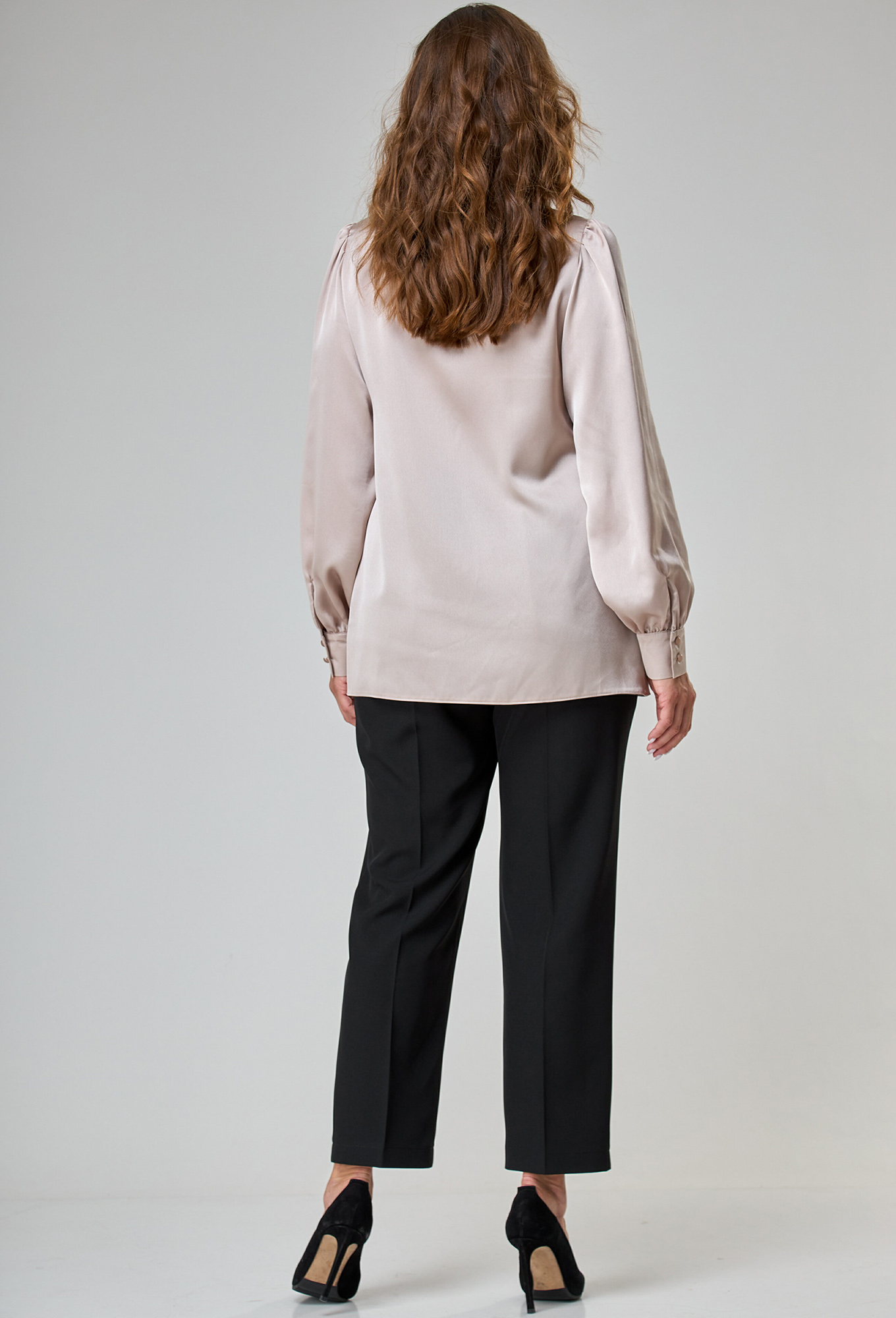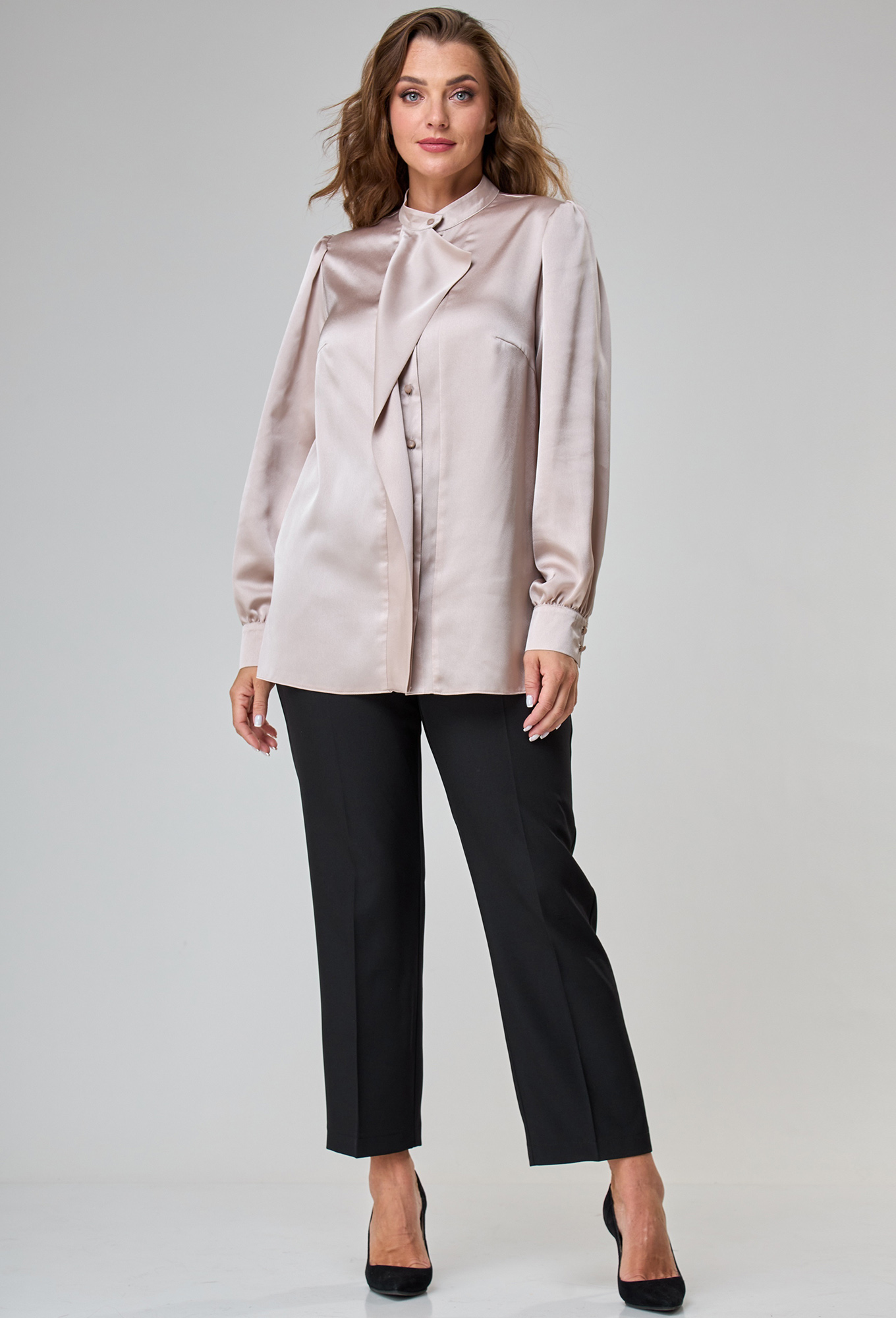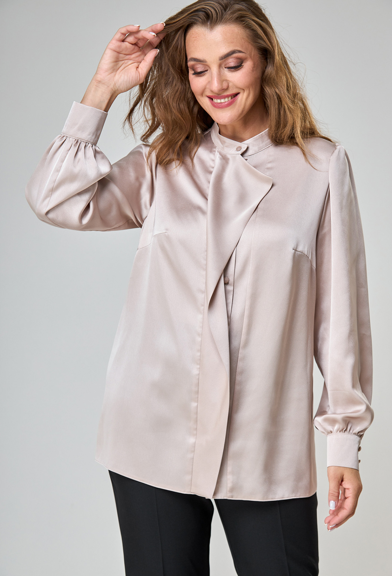 Модель: Анастасия Мак 1044 бежевый ..показатьi>Рост: 164 см (девушка на фото ростом 170см) Сезон: Круглогодичный Тип ткани: 100% ПЭБлузка прямого силуэта, выполнена из однотонной блузочной ткани. Полочка блузки с застежкой на петли и пуговицы по притачной планке. Полочка блузки с нагрудными вытачками, по правой полочке выполнен декоративный элемент в виде свободно ниспадающей детали. Горловина круглой формы, обработана воротником стойкой. Спинка цельная. Рукав втачной одношовный. По низу рукав со сборкой на притачной манжете. По окату рукава также выполнена сборка. Длина блузы 72-73см. Длина рукава с манжетой 64,5 - 65,5 см.i>Рост: 164 см (девушка на фото ростом 170см) Сезон: Круглогодичный Тип ткани: 100% ПЭ