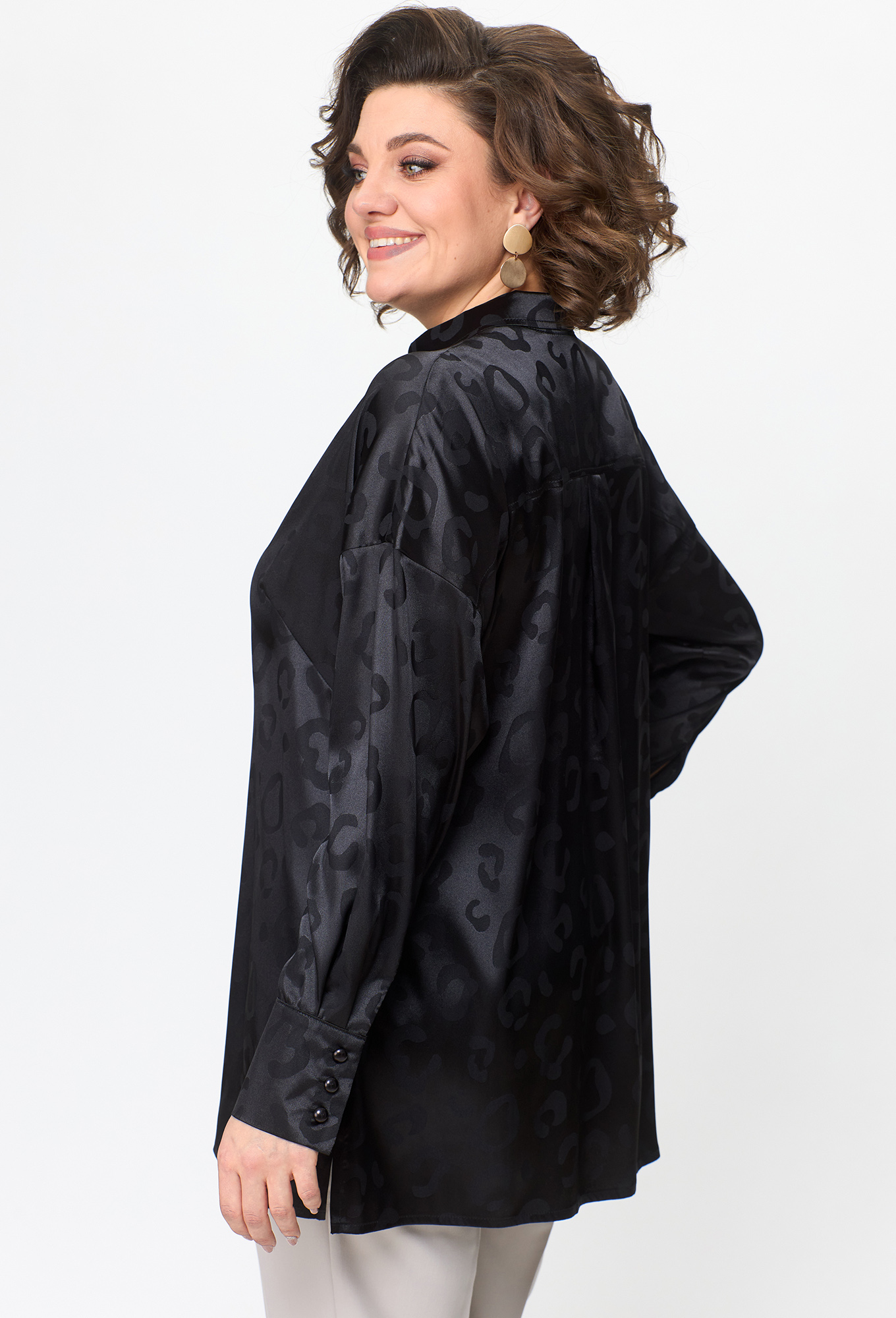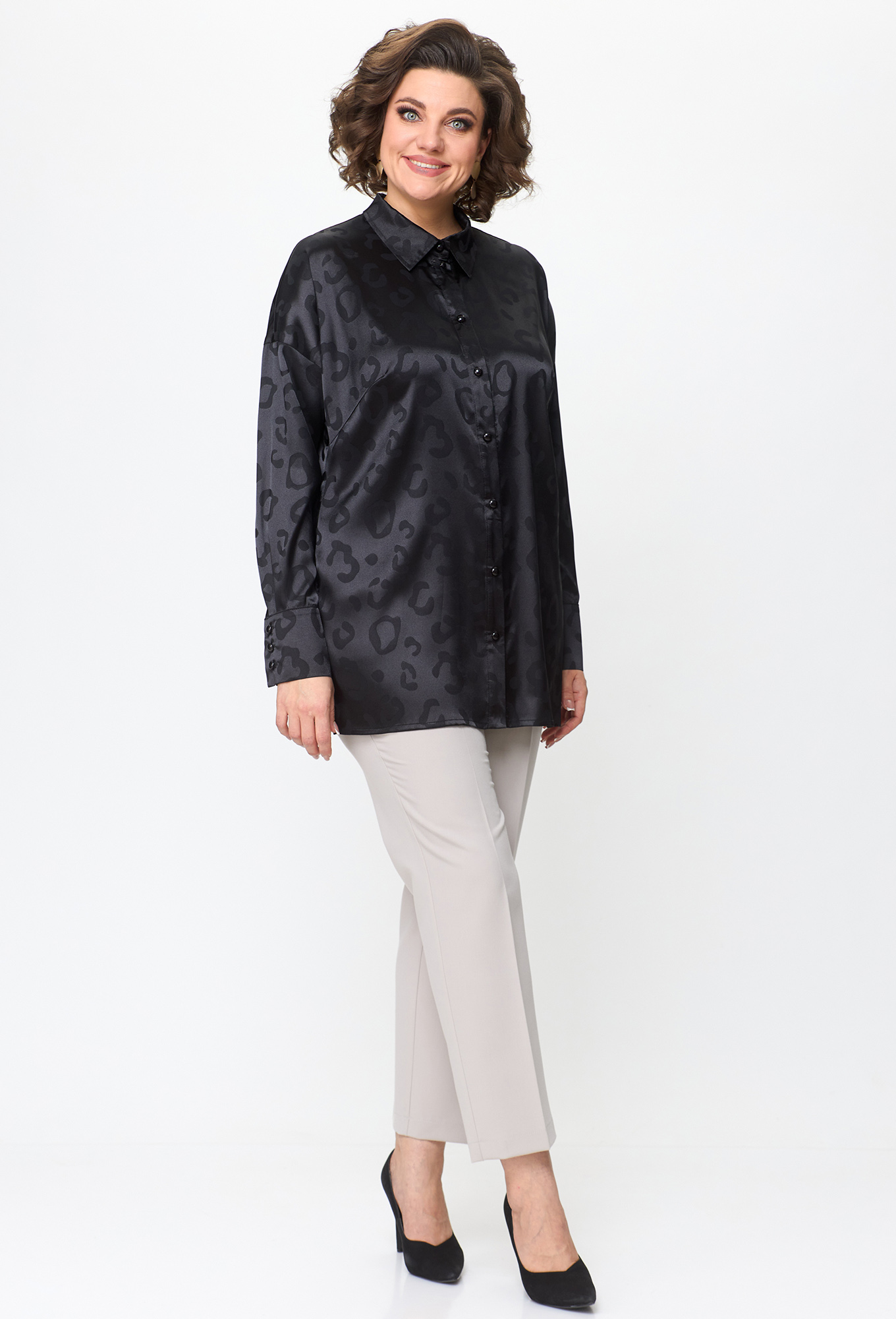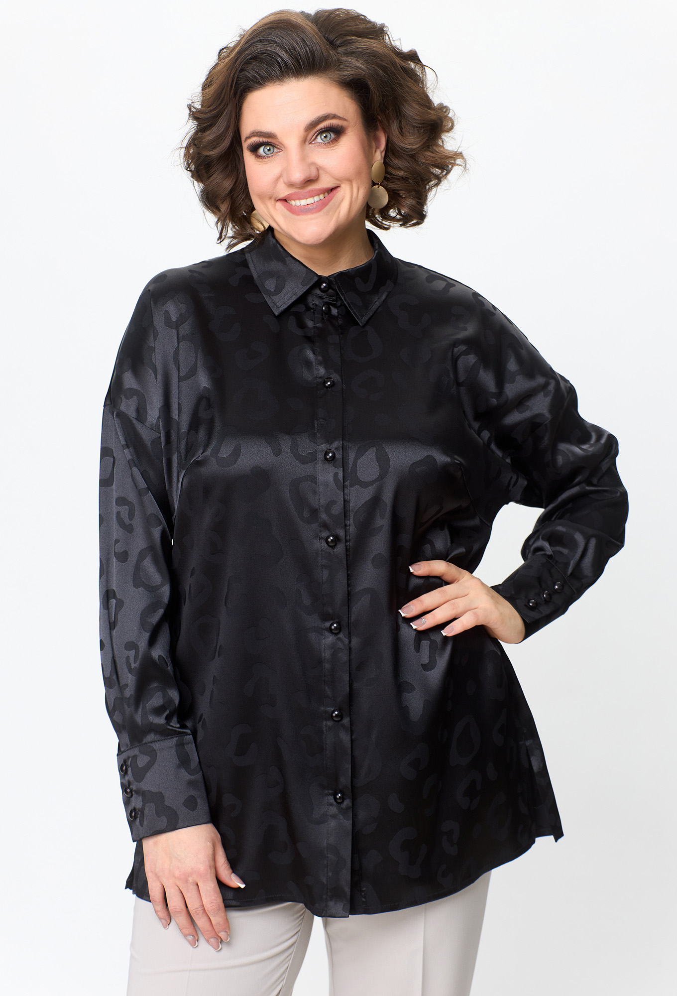 Модель: Анастасия Мак 1143 черный ..показать>Рост: 164 см (девушка на фото ростом 170см) Сезон: Круглогодичный Тип ткани: 100% ПЭБлузка прямого, свободного силуэта выполнена из однотонной ткани с жаккардовым эффектом рисунка под леопард._x000D_