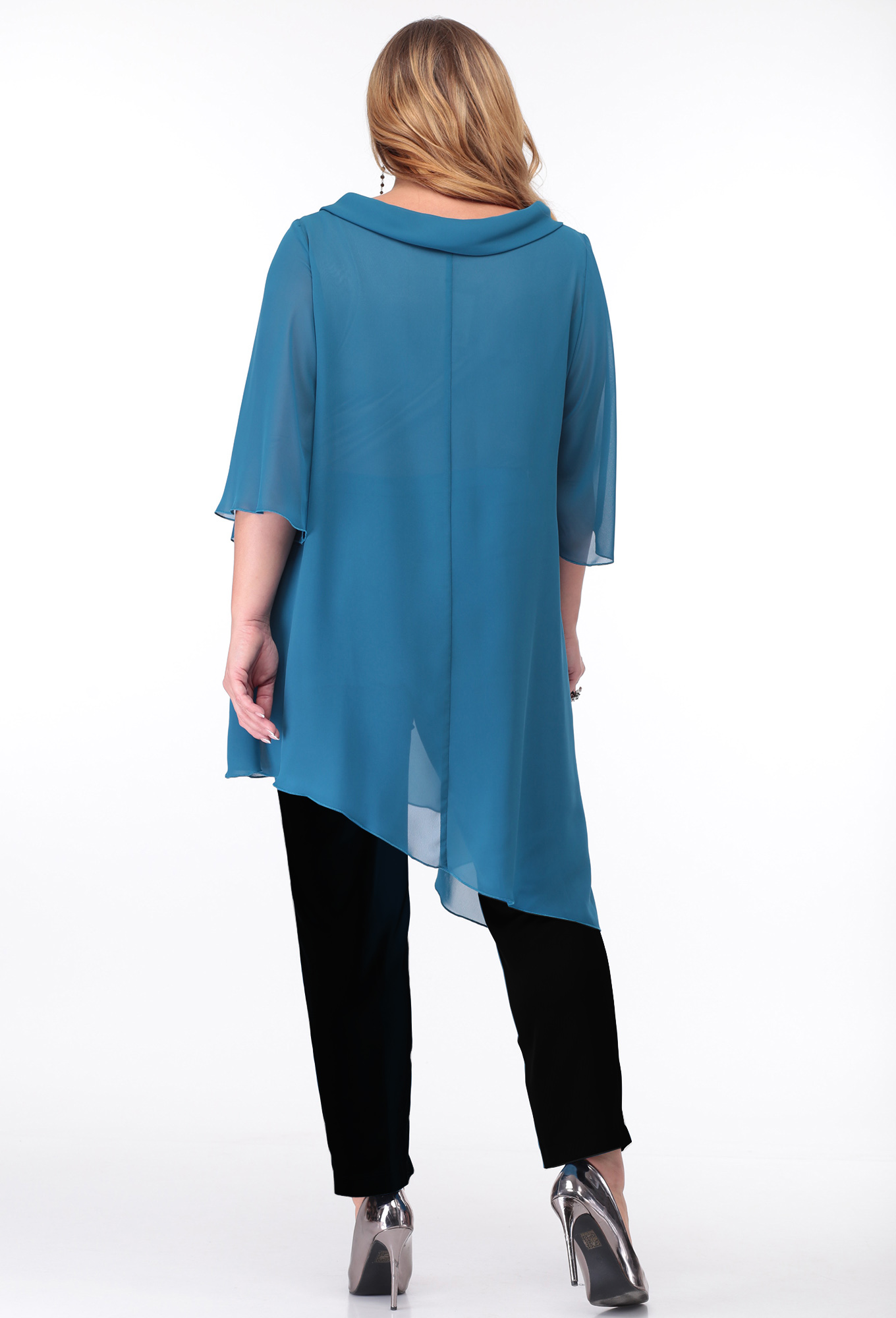 Модель: Анастасия Мак 660Б голубой ..показатьi>Рост: 164 см (девушка на фото ростом 170см) Сезон: Круглогодичный Тип ткани: Шифон - 100% Полиэстер;Блуза - 96% Полиэстер, 4% Спандекс;Костюм состоит из блузки и брюк. Блузка выполнена из однотонного шифона, в качестве подкладки в блузе использовано однотонное трикотажное полотно. Брюки выполнены из однотонной ткани. Блузка А-образного силуэта, с асимметричным низом. Горловина овальной формы, обработана воротником-планкой, спереди по левой части горловины декор из шифона и броши. Спинка со средним швом . Рукав одношовный, втачной, длиной 3/4 , расширенный по низу. Нижняя часть блузки - подкладка в виде майки. Полочка майки с нагрудными вытачками, спинка цельная.i>Рост: 164 см (девушка на фото ростом 170см) Сезон: Круглогодичный Тип ткани: Шифон - 100% Полиэстер;Блуза - 96% Полиэстер, 4% Спандекс;