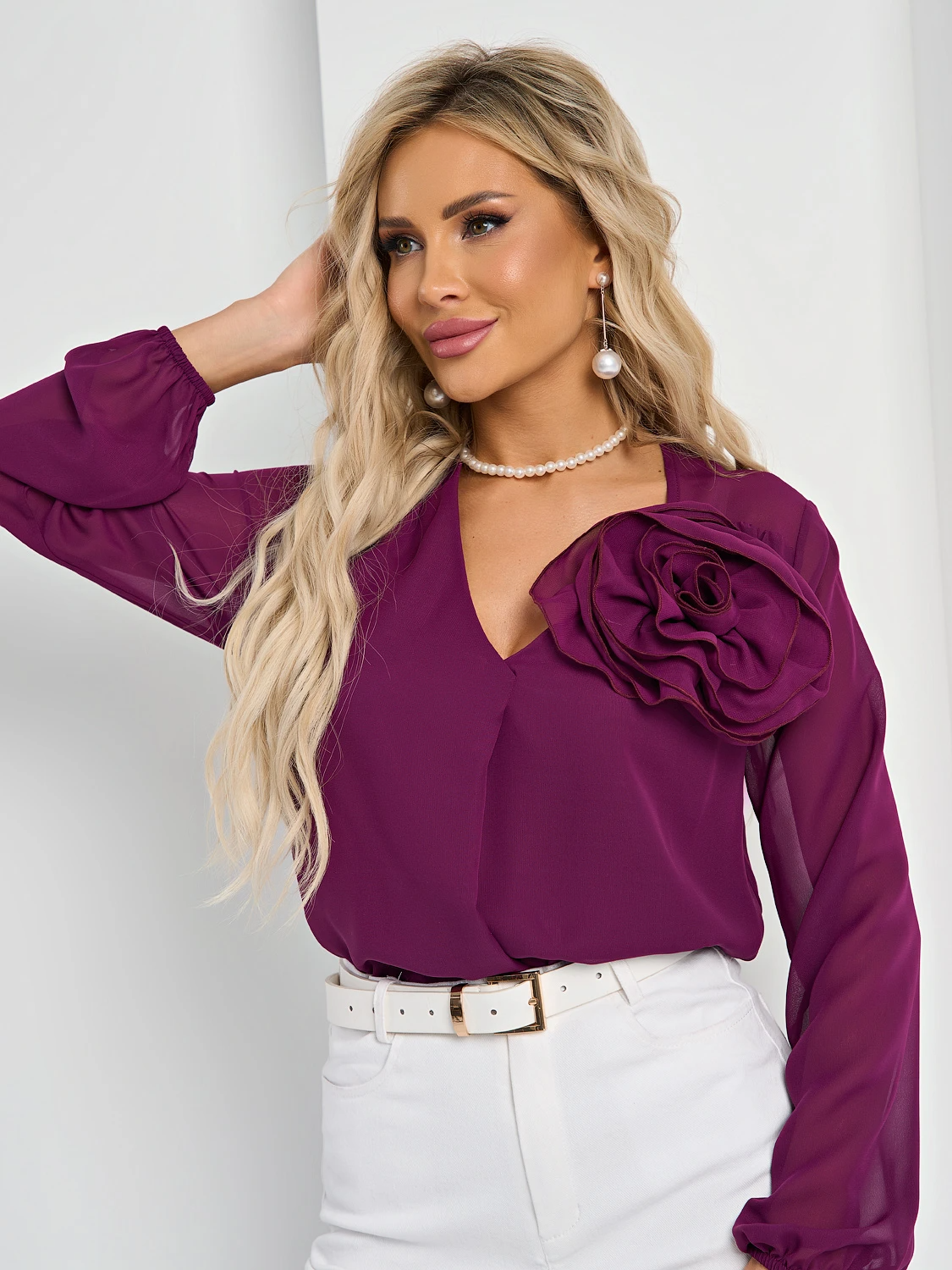 Блуза прямого кроя с V-образным вырезом.