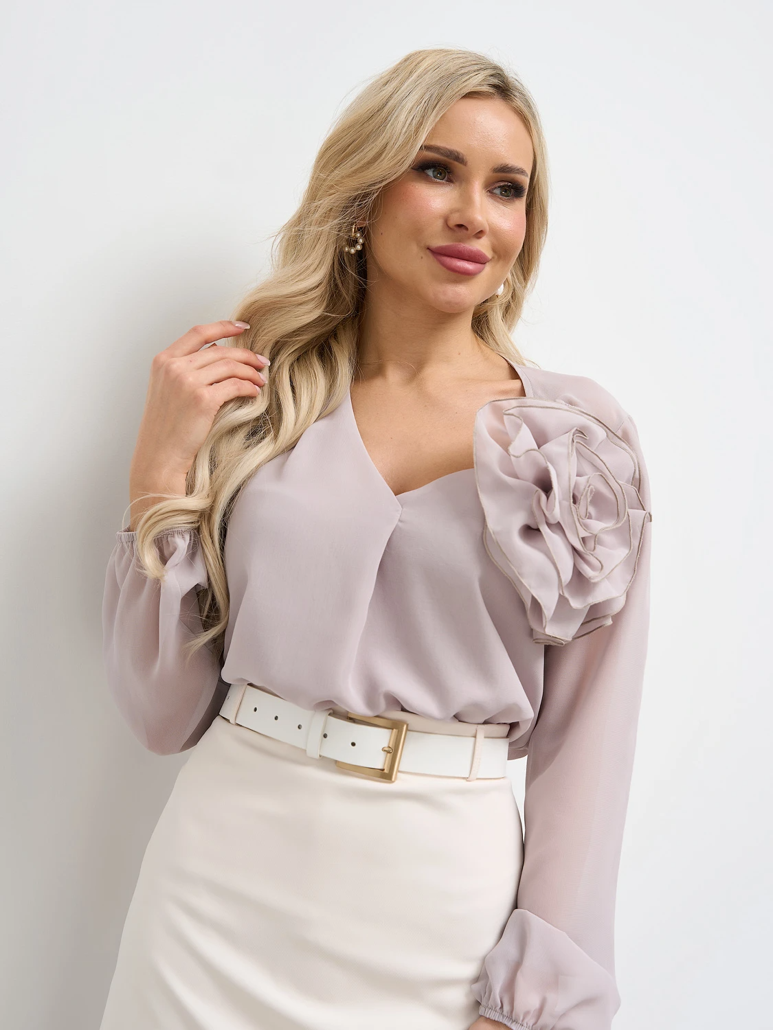 Блуза прямого кроя с V-образным вырезом.