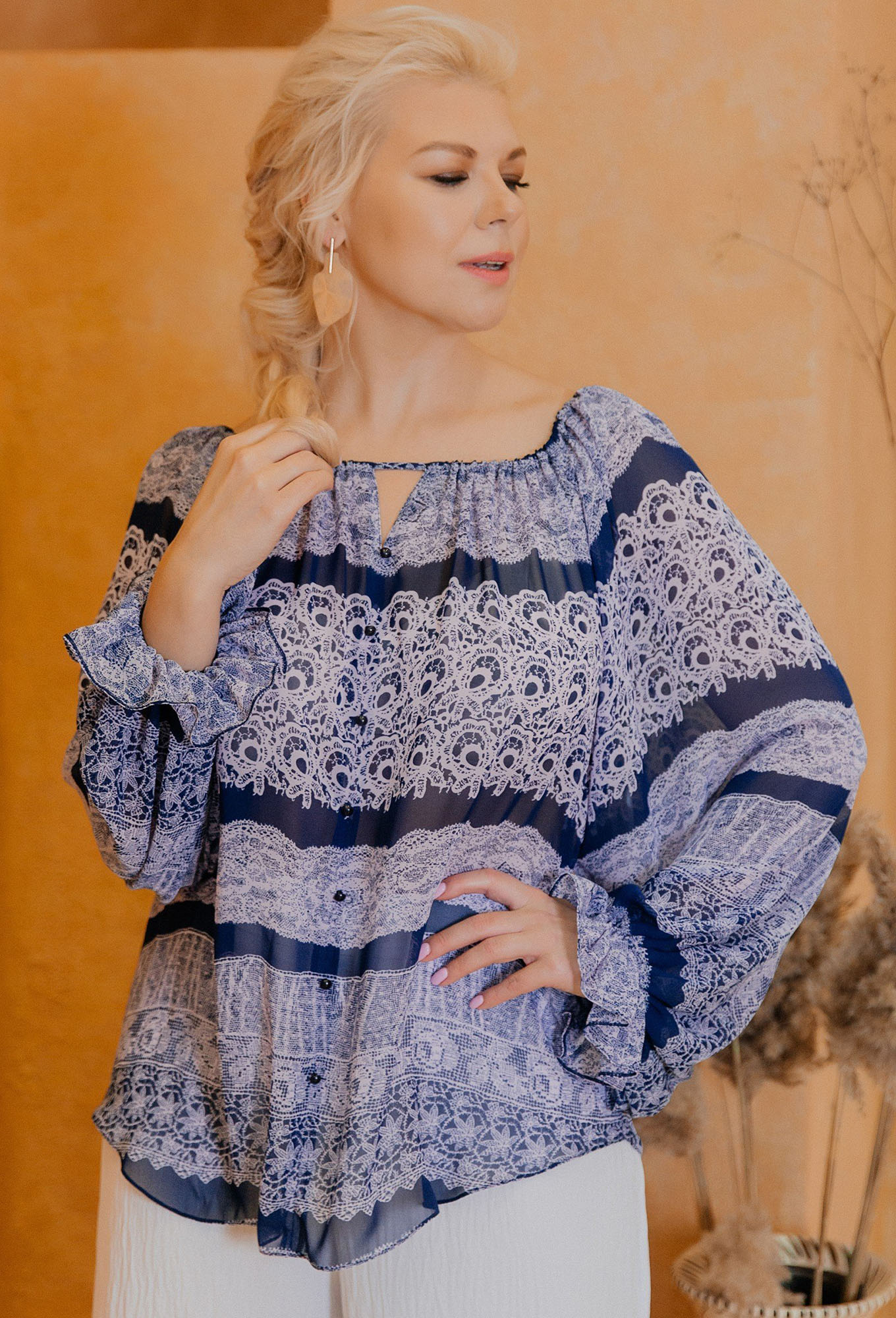 Модель: АСВ 2402 синий Рост: 164 ..показатьсм (девушка на фото ростом 164см) Сезон: Круглогодичный Тип ткани: Вискоза 65%, полиэстер 25%,нейлон 10%Блуза прямого силуэта с длинным широким рукавом с имитацией манжеты. Горловина расширенная с резинкой. По переду декоративный шов с пуговицами.