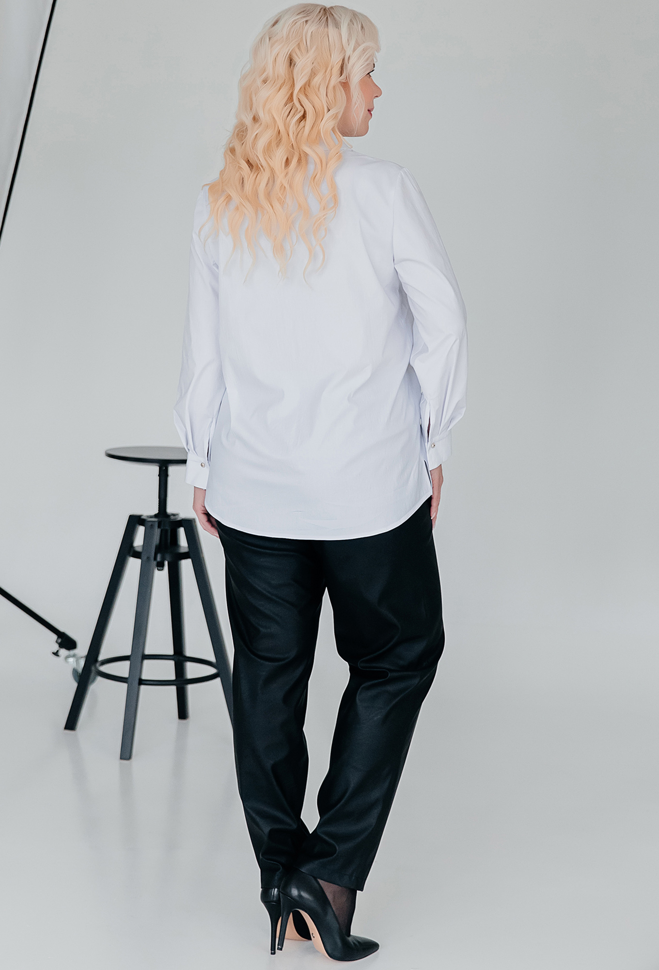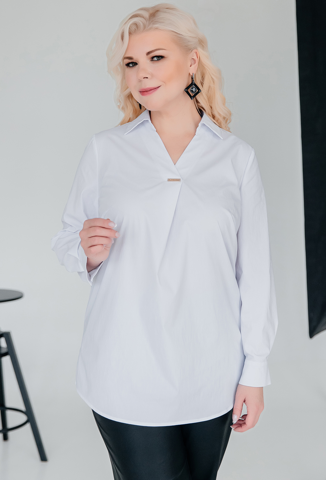Модель: АСВ 2446 белый Рост: 164 ..показатьсм (девушка на фото ростом 164см) Сезон: Круглогодичный Тип ткани: Хлопок 97%, эластан 3%Блуза прямого силуэта с длинным рукавом с манжетой. Горловина V- образной формы с рубашечным воротником. По переду односторонняя складка с декоративной пришивной пластиной. По боковым швам – разрезы.