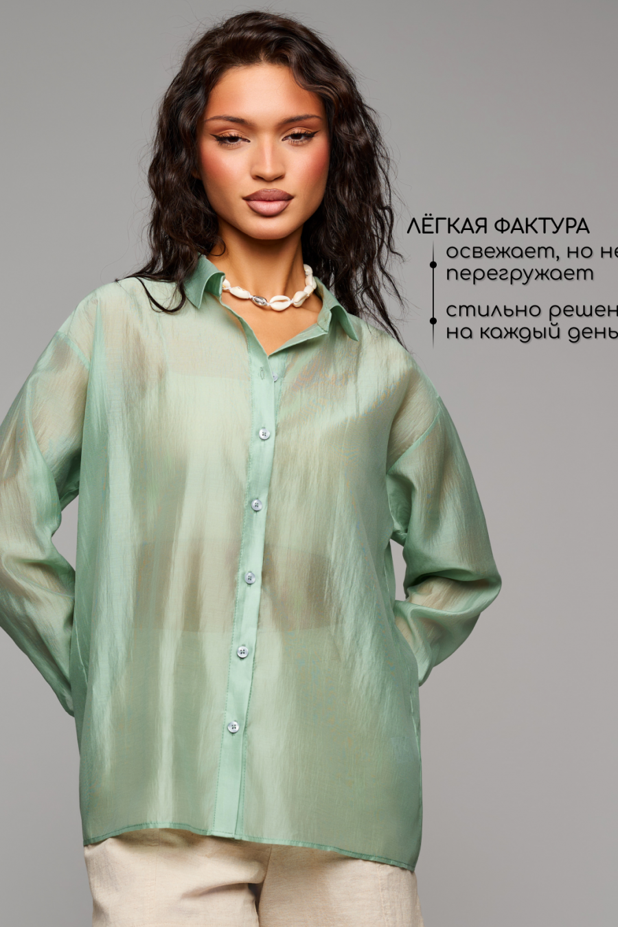 Прозрачная рубашка из тенселя — идеальный выбор для весны и лета. Легкая, дышащая ткань дарит комфорт даже в жару, а свободный крой и длинные рукава придают образу элегантность. Полупрозрачная текстура и отложной воротник сочетают строгость и женственность. Подходит для офиса, учебы, отдыха, свиданий и пляжа — можно носить как накидку на купальник. Однотонный дизайн легко комбинируется с брюками или шортами. Универсальна для девушек любого возраста и роста. Качественный пошив и премиум-материалы сохраняют форму после стирок. Идеальный базовый элемент стильного гардероба.
