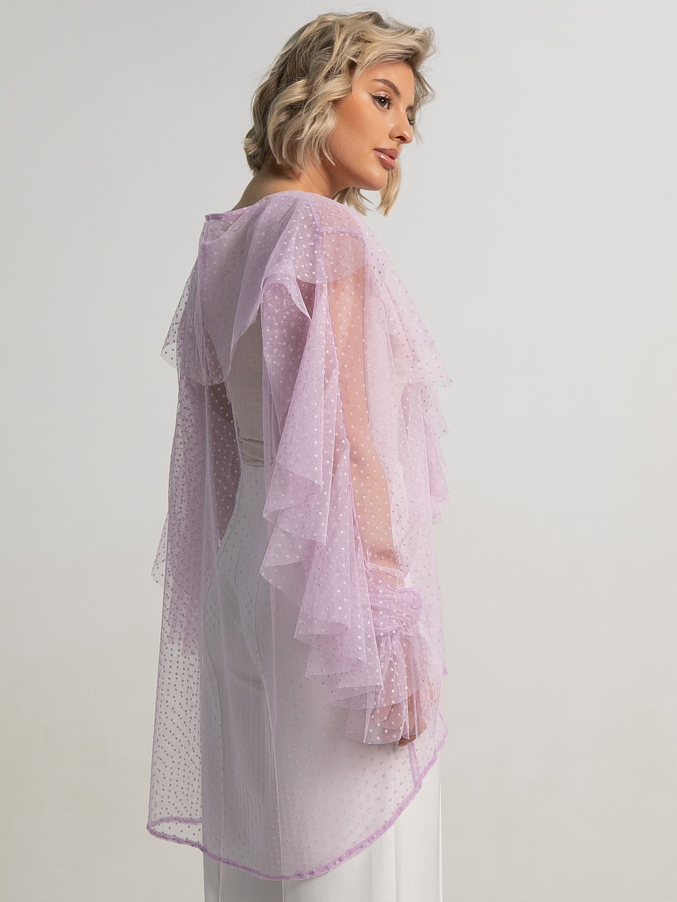 Романтичная блузка из сетки станет идеальным выбором как для торжественных мероприятий, так и для повседневного стиля. Длинные рукава с манжетами на резинке и воланами придают образу элегантность, а V-образный вырез добавляет нотку утонченности. Воланы по рукавам и передней части модели делают блузку особенно женственной и изящной. Комбинируйте ее с джинсами, брюками или юбкой-карандаш для создания делового образа в офисе или нарядного ансамбля для особых случаев.