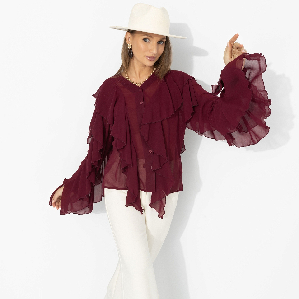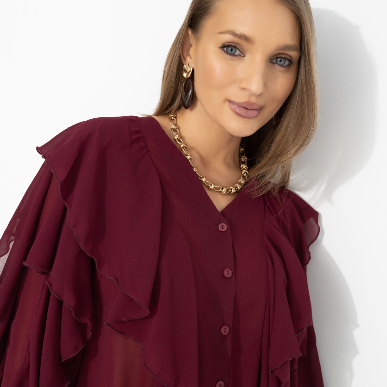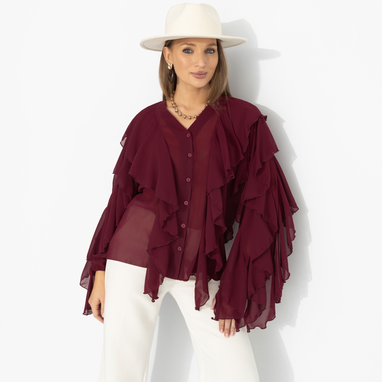 Представь: ты выходишь из особняка на берегу Босфора – и ветер играет рукавами твоей блузы, как в лучших сценах турецких сериалов. Глубокий винный оттенок звучит страстно, шифон струится и создаёт воздушный эффект, многослойные воланы двигаются в такт каждому шагу. Это не просто образ – а момент, когда в одном кадре роскошь и стиль.
