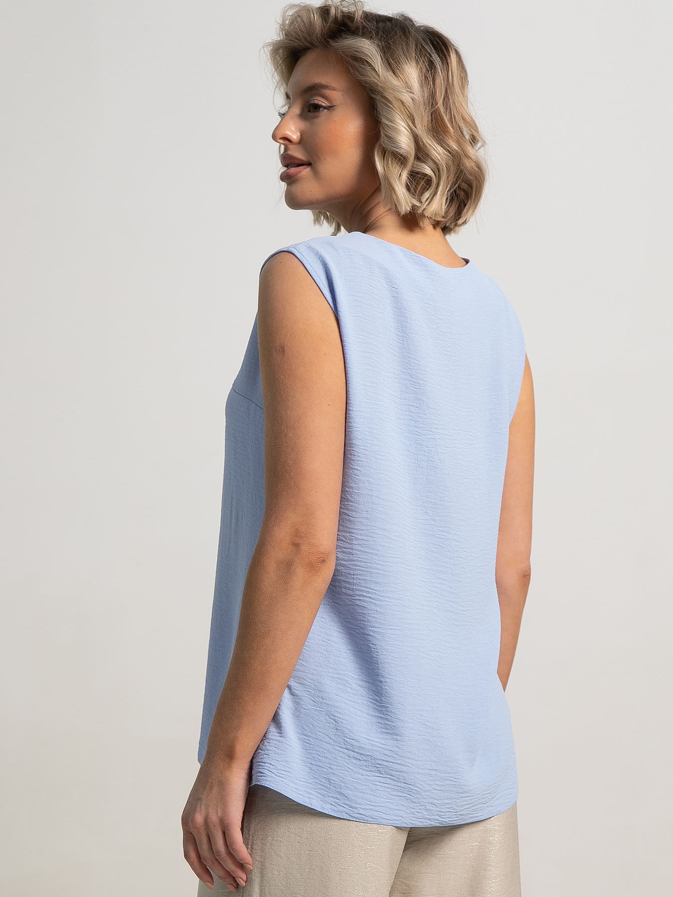 Летняя блуза без рукавов голубого цвета — идеальное дополнение вашего гардероба для жарких дней. Она выполнена из легкого материала, который дарит комфорт и свободу движений. Нежный голубой оттенок создает атмосферу свежести и легкости, а воздушный силуэт подчеркивает фигуру, не стесняя движения. Сочетайте ее с легкими шортами, юбками или стильными джинсами — и ваш образ будет безупречен.
