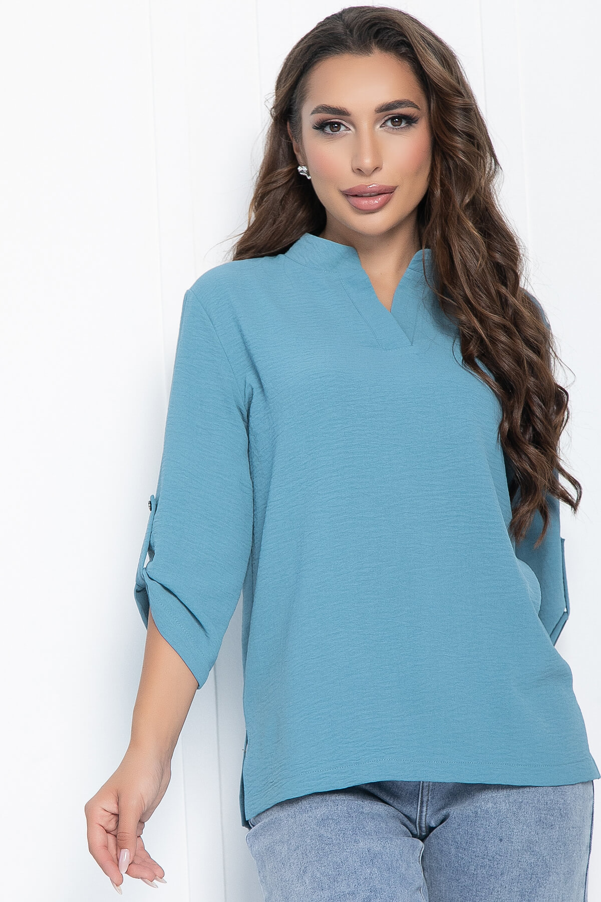 Лёгкая блуза свободного кроя в красивом цвете морской волны. Классический воротник-стойка, рукав три четверти, на пате. По бокам есть разрезы. Такая блуза подойдёт для создания офисного образа, а также её можно использовать в повседневных ансамблях.