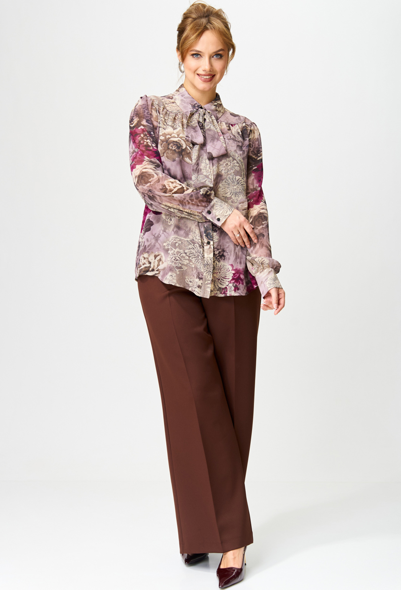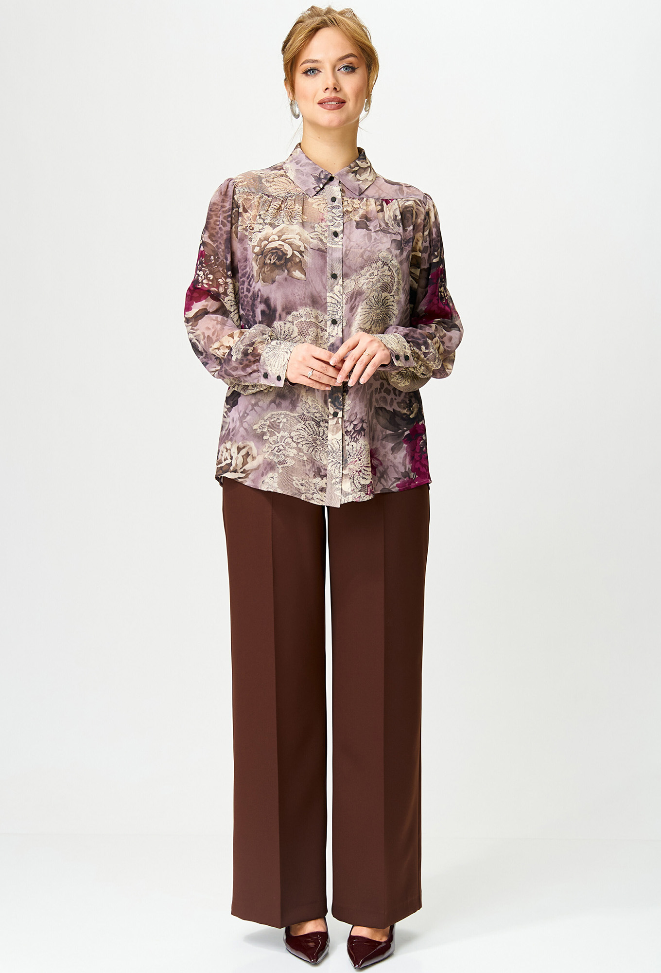 Модель: Гизарт 15343 розовый цветы ..показатьi>Рост: 164 см (девушка на фото ростом 170см) Сезон: Круглогодичный Тип ткани: Полиэстер 100%Блузка прямого силуэта из блузочной ткани. Перед с центральной застежкой на притачной планке. Перед и спинка с кокетками. В нижней части переда и спинки блузки по линии стачивания с кокеткой сборка. Воротник на стойке. По задней части стойки настрочена шлевка, в которую вставляется съемный бант. Рукав втачной одношовный по низу со сборкой по линии притачивания к манжете и со сборкой по окату. Манжета застегивается на 2 петли и пуговицы.