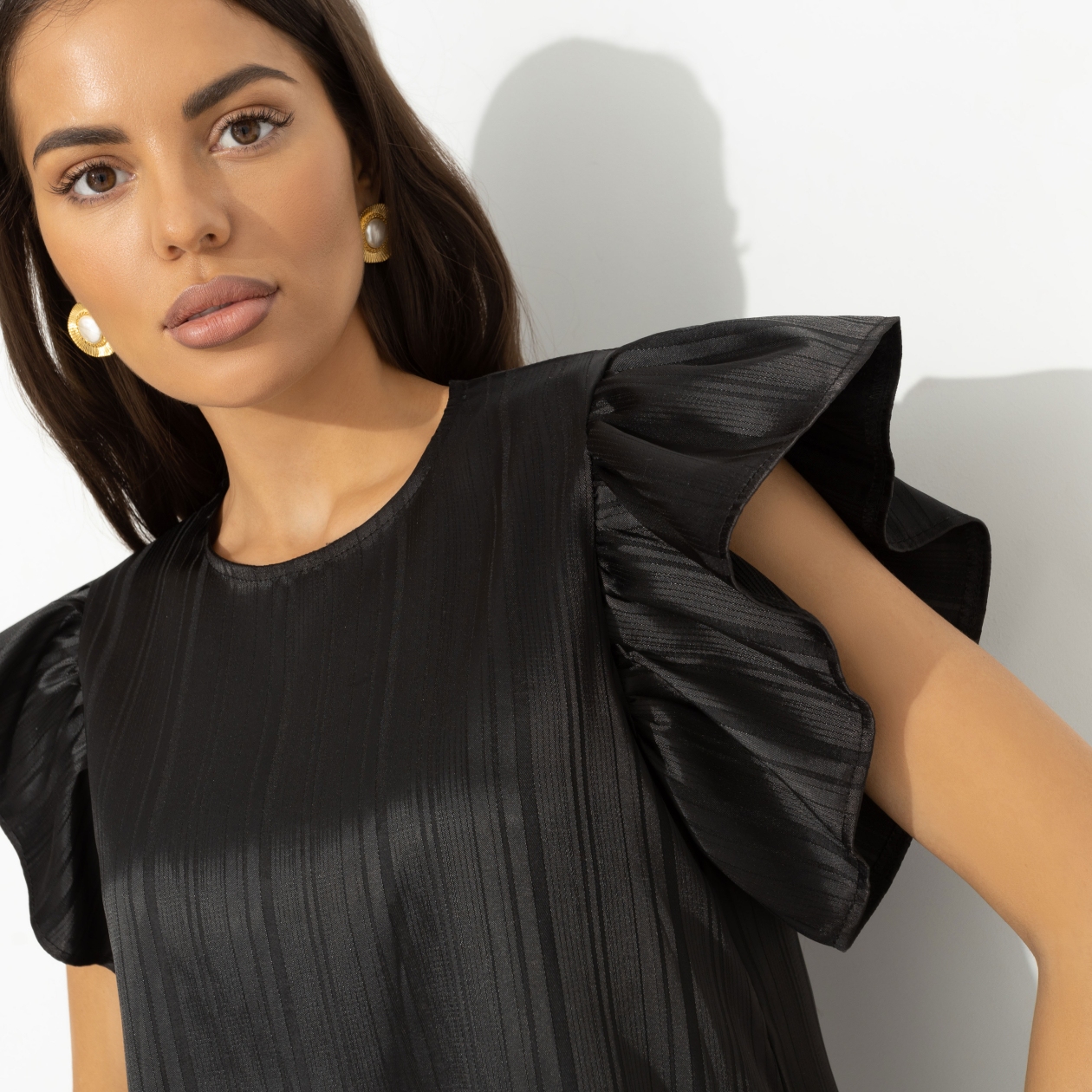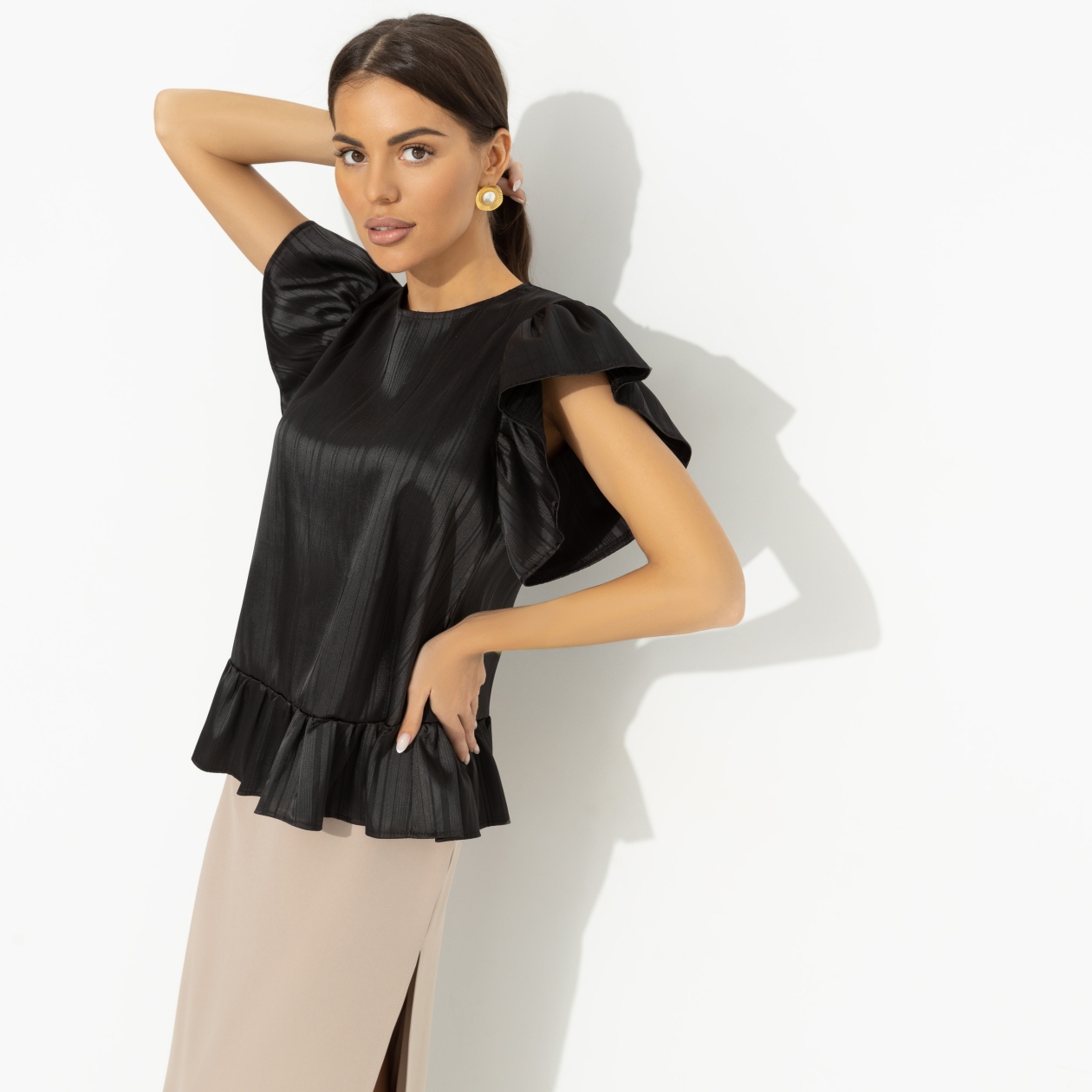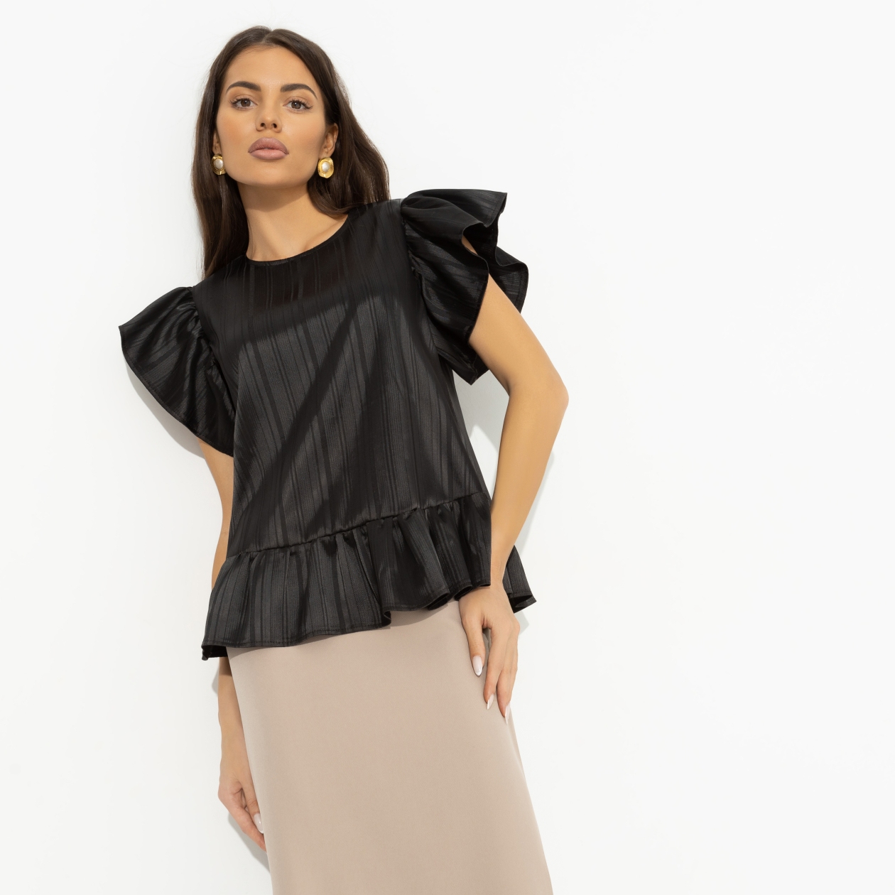 «У меня все логично, просто другой тип логики», – это выражение режиссера Дэвида Линча предлагаем взять на вооружение. Использовать, когда муж спросит, логично ли покупать еще одну блузу в черном цвете, а ты уже оплатила. Блуза свободной посадки. Объемные рюши на подоле изделия и на плечах. Ткань изделия в тонкую полоску.