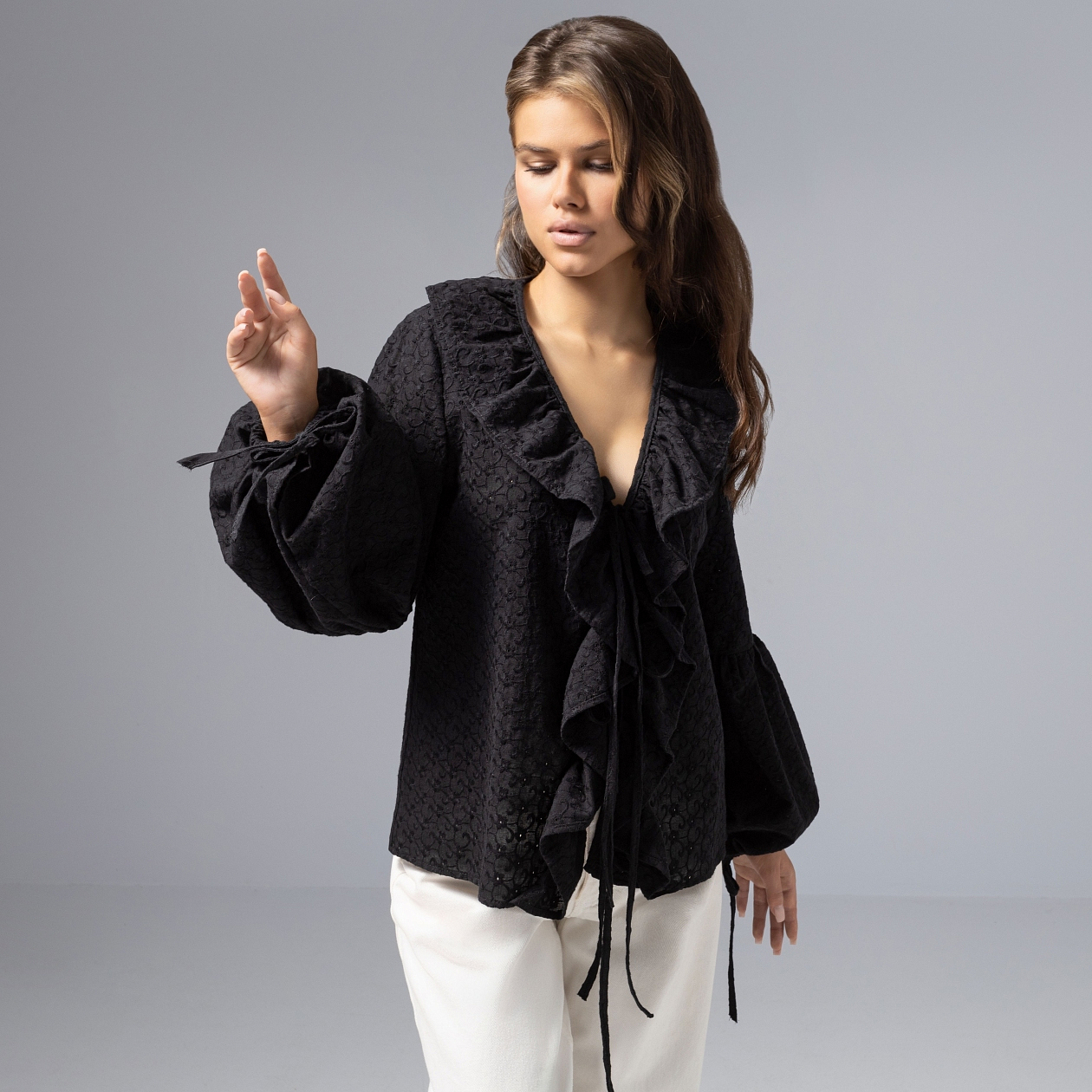 Тренд сезона – завязки, как у Ganni, плюс щедрая порция рюш и объемные рукава. Не просто блуза, а приглашение к кокетству: немного богемы, немного французской легкости, и максимум женственности. 100% хлопок, вышитый поплин с фактурным узором, рюши по краю и трендовые завязки на груди и рукавах. Свободный крой с акцентом на декольте – идеально для тех, кто ценит стиль, который точно сработает.