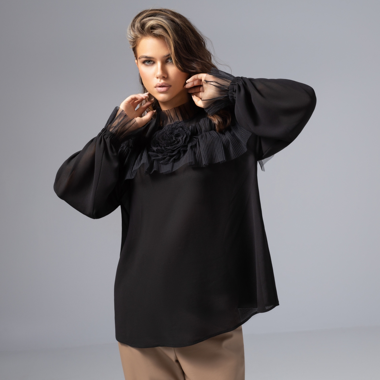 Её появление всегда вызывало легкое напряжение в воздухе. Однажды она просто вошла – в черной блузе ЧАРУТТИ, с роскошным декором и волной прозрачной сетки на плечах. В её глазах – притяжение, в походке – обещание приключений. Роковая красота не требует лишних слов. Сегодня – она сама диктует правила игры. Блуза свободного кроя из шифона с притягтельной текстурой. Для тех, кто выбирает стиль с характером и любит становиться поводом для восторгов.