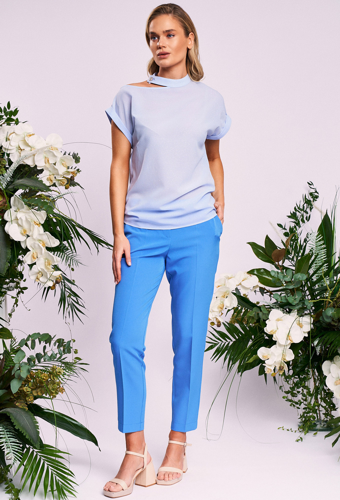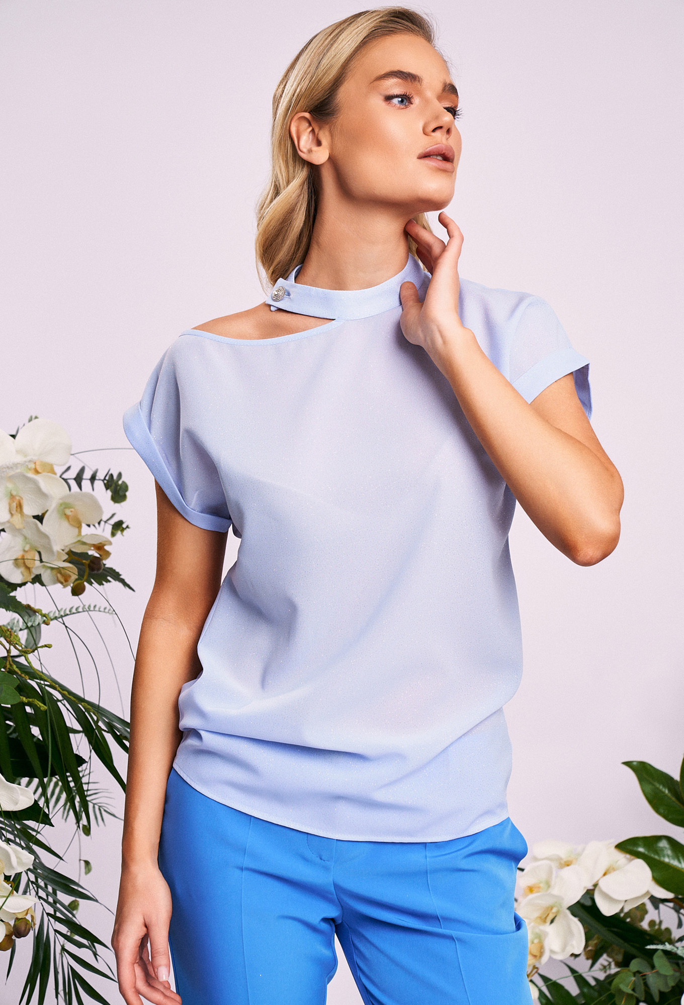 Модель: Кавари 4008 голубой Рост:..показать 170 см (девушка на фото ростом 170см) Сезон: Круглогодичный Тип ткани: пэ 100%Нарядная женская блуза свободного силуэта длиной до середины бедра.Воротник стойка с боковой застежкой на петлю и пуговицу.Рукав цельнокроеный с отложными манжетами.Верх Блузы ассиметричной формы - одно плечо открыто. _x000D_