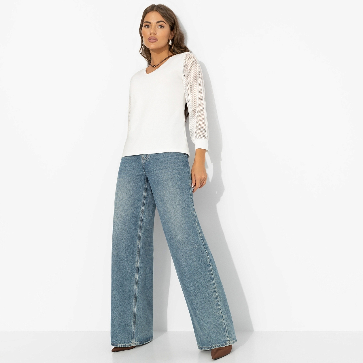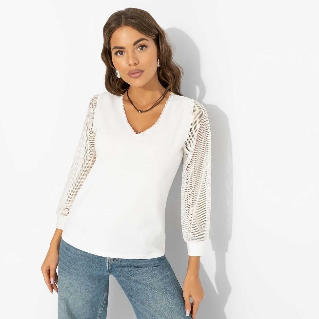 Молочная сетка рукавов блузы ЧАРУТТИ стала её тайным оружием. В блузе она защитила важный проект. Легкость и уверенность стала атмосферой офиса. Она не просто презентовала проект, она была его воплощением. Впереди повышение! Блуза классического кроя. Прямой силуэт изделия. Рукава оформлены сеткой в тон изделия. Зона декольте обрамлена лаконичной линией кружева. Блуза хорошо смотрится в заправленном виде и навыпуск.