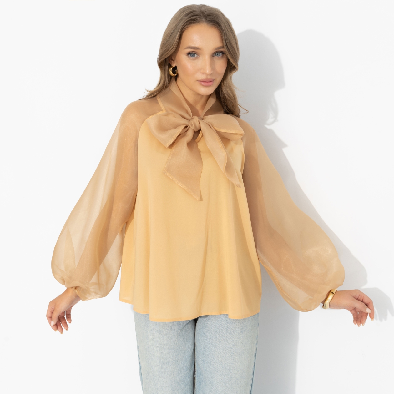 Почему эта блуза – больше, чем образ? Ответ прост: она умеет создавать вау-эффект женственности без усилий. Воздушная, с ноткой театральности и настроением светского выхода, она собирает комплименты в тот же миг, как появляетесь в поле зрения. Носите с джинсами, юбкой или строгими брюками – ЧАРУТТИ за универсальность. Модель свободного силуэта. Объемные рукава на манжетах и акцентный бант у горловины. Комфортная посадка для любой фигуры, не просвечивает.