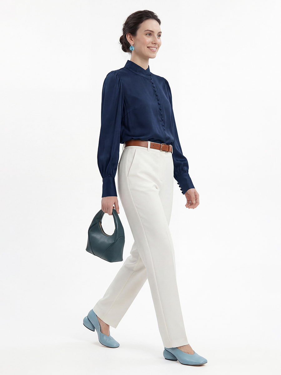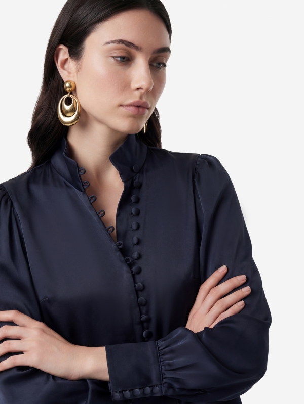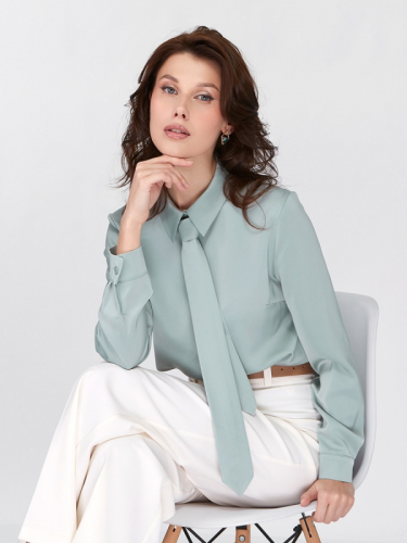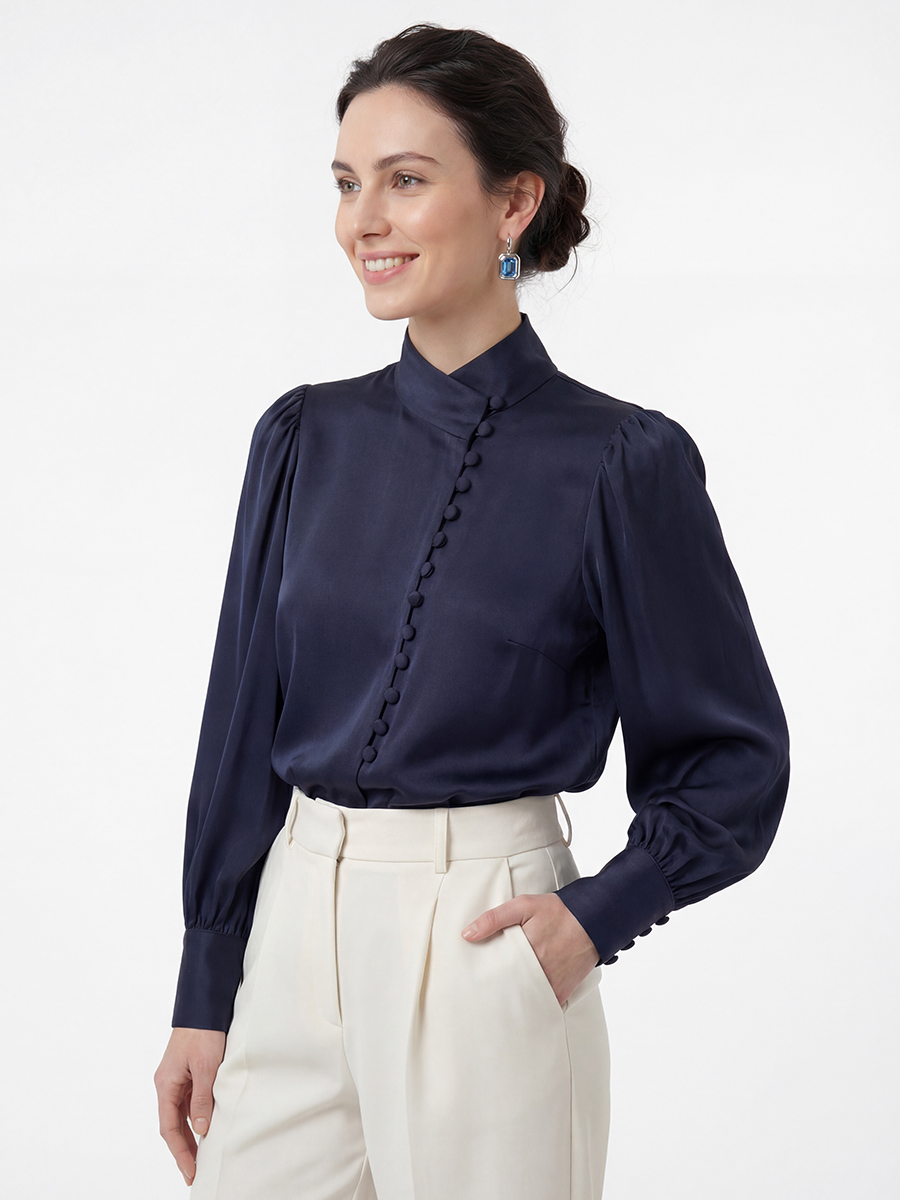 Блуза-косоворотка прямого силуэта с длинным рукавом на высокой манжете из плотной блузочной ткани. Воротник и манжеты изделия украшены большим количеством воздушных петель и мелких пуговиц,окрашенных в тон ткани. Рост модели 172 см. Блузка на модели 42-го размера. Машинная деликатная стирка.
