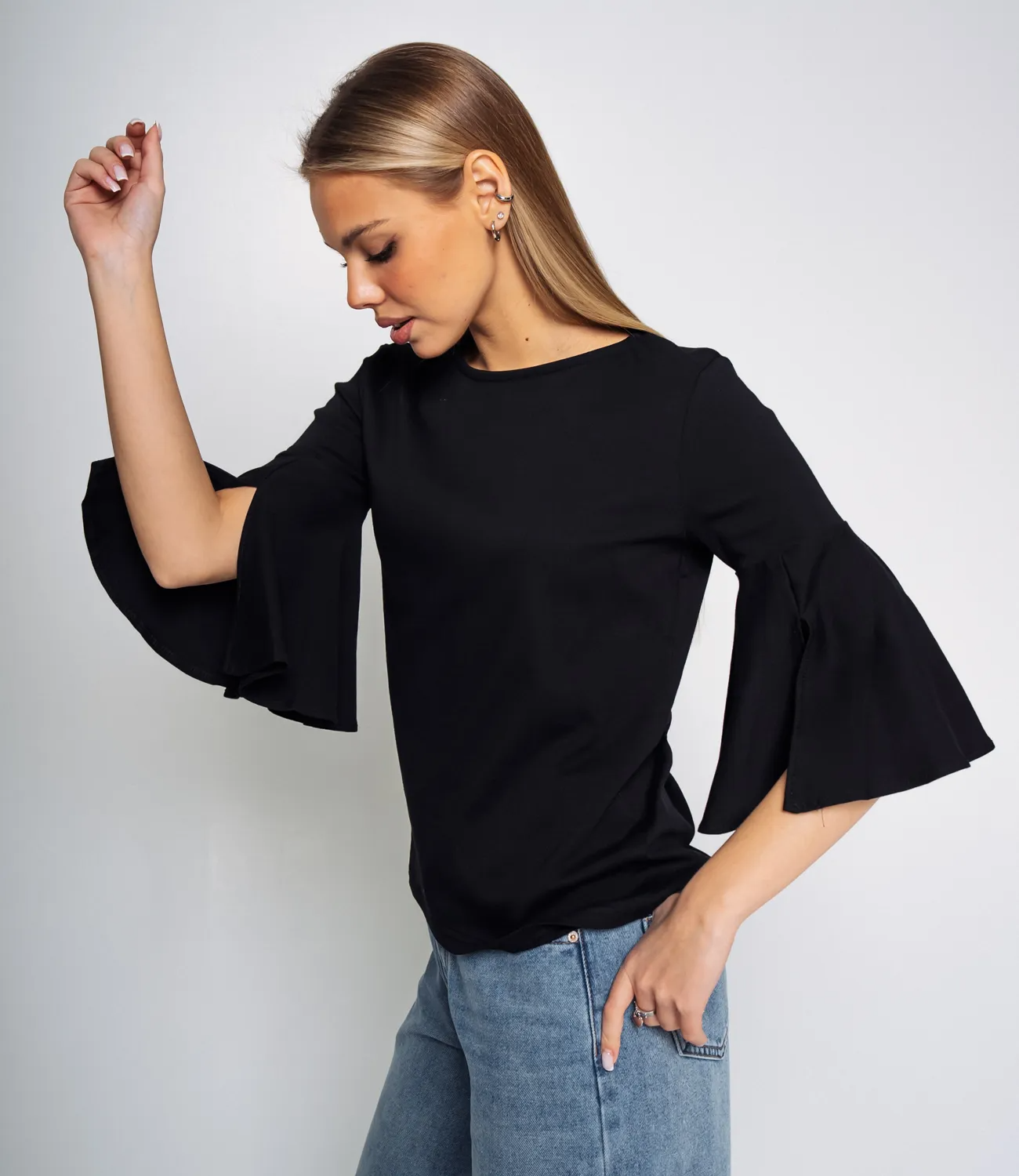 Легкая блуза с нежными рукавами волной добавит в образ нежности и женственности. Хлопковая ткань будет сохранять теплообмен и позволит коже дышать.