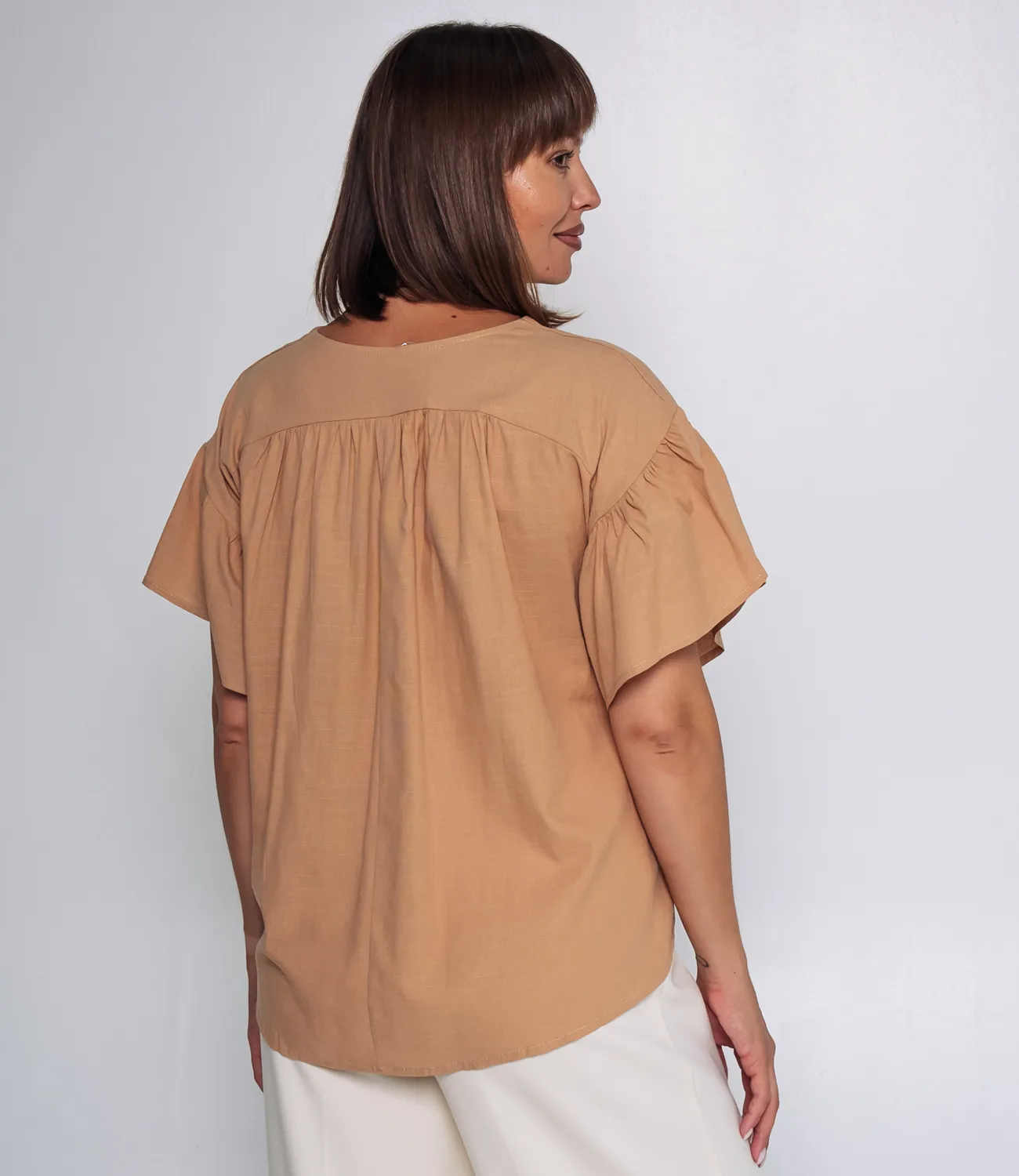 Элегантная женская блузка с оригинальным декором станет стильным дополнением повседневного и делового образа. Она декорирована рюшами на руковах. Легкая струящаяся ткань придает образу женственности и изысканности. Модель отлично сочетается с джинсами, юбкой любой длины, брюками.