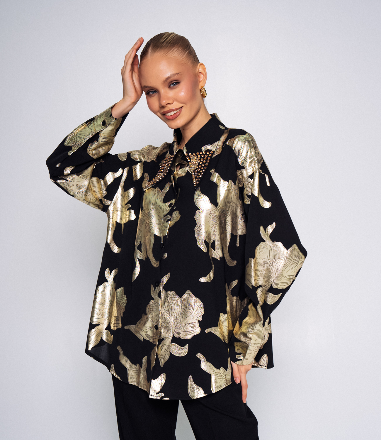 Блуза – это вещь, которая подчеркивает женственность и уникальность каждой представительницы прекрасного пола. Данная модель – яркая блуза с цветочным принтом, которая отлично подойдет для демисезонного периода. Ее предпочитают покупательницы, которые ценят сочетание качества и стильного дизайна. Фасон подчеркивает привлекательность фигуры. Компания знает, как разработать модные и эффектные решения. Для пошива использована ткань 100% полиэстр, которая характеризуется отменным качеством. Даже после множества стирок блуза не утратит первоначальной привлекательности. Вы будете носить ее с радостью. Обратите внимание на яркий цветочный принт и стразы на воротнике, которые добавляют изюминку и полностью соответствуют фотографии на сайте. Чтобы вы были уверены в размере, мы представили на странице таблицу. Воспользовавшись ею, вы сможете самостоятельно обмерить себя и удостовериться. Установленная нами цена является приемлемой. Подарите себе удовольствие выглядеть стильно и элегантно! Параметры модели: рост 173, 84-58-89.