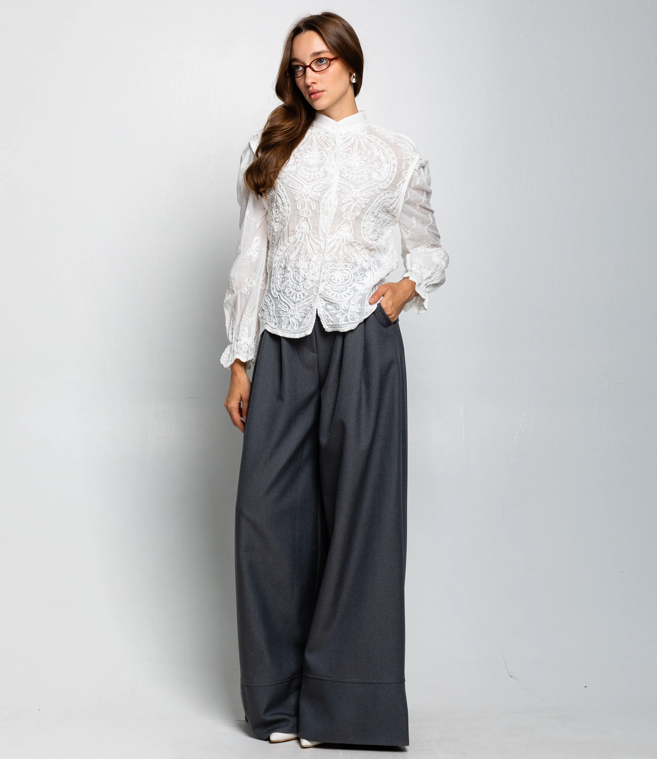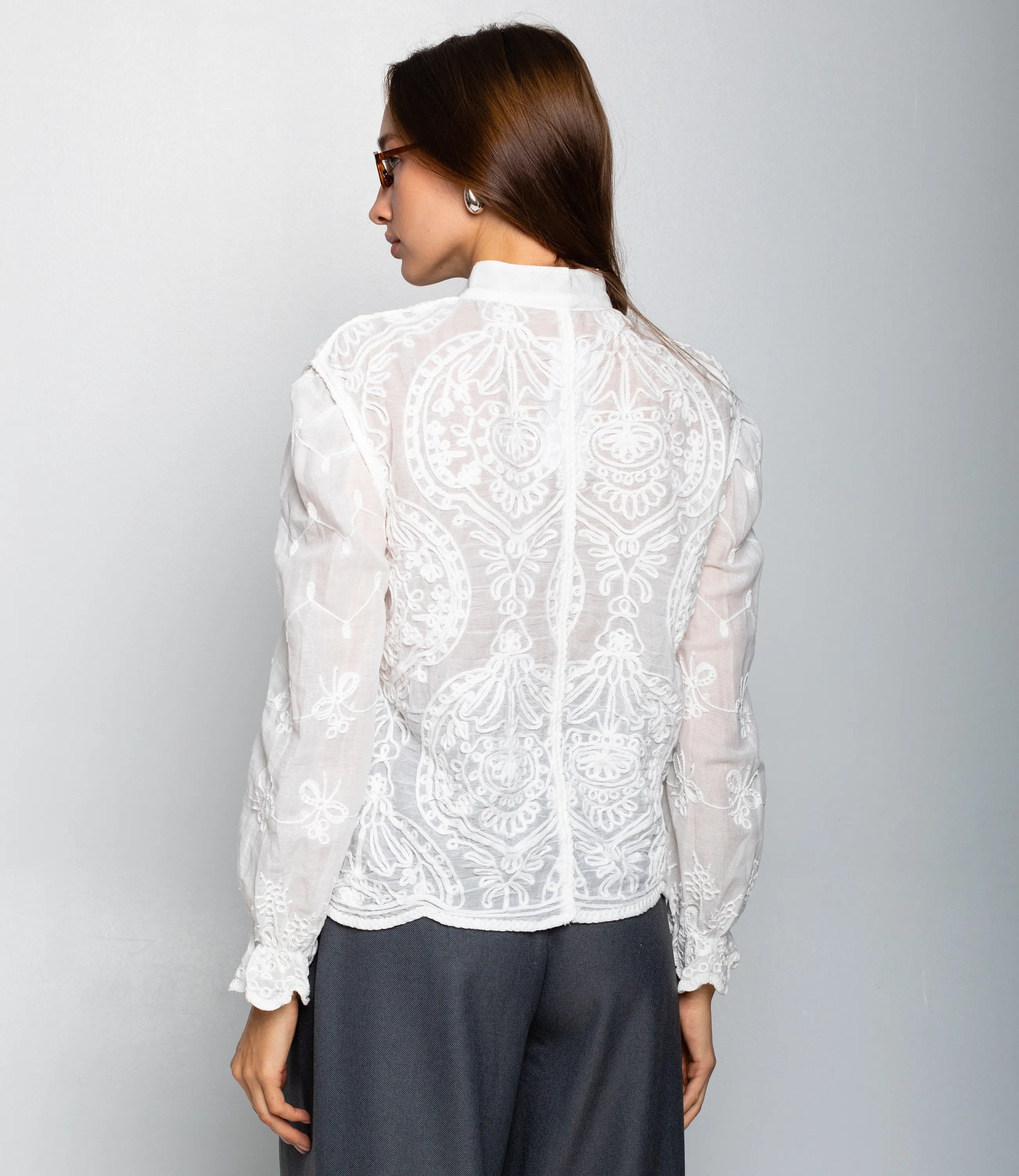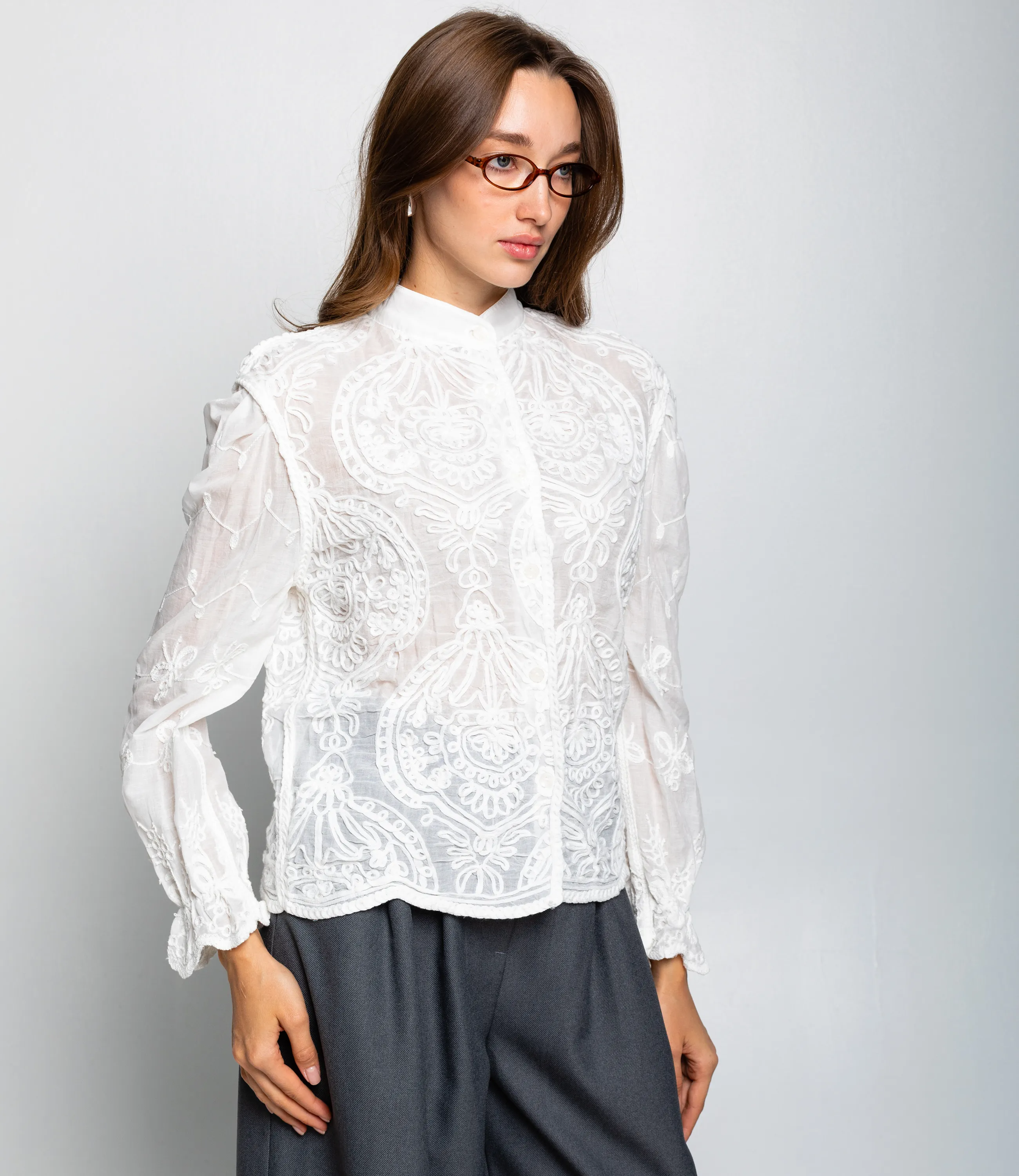 Блуза — это незаменимый элемент гардероба, который подчеркнет индивидуальность и стиль каждой женщины. Эта прекрасная модель, выполненная из 100% хлопка, отличается легкостью, создавая воздушный и нежный образ. Полуприлегающий силуэт с небольшим объёмом в плечевой зоне. Обильная ажурная вышивка в тон — крупные симметричные орнаменты по передней части и рукавам, создающие рельефную текстуру. Манжеты и низ украшены мелкой рюшевой или кружевной отделкой; швы аккуратно обработаны, декоративные элементы тон в тон. Установленная цена является приемлемой и выгодной для оптовых покупателей, что делает вашу коллекцию еще более привлекательной. Не упустите возможность предложить своим клиентам эту удивительную блузу, которая добавит в их гардероб стиль и элегантность. Подарите вашим покупателям возможность чувствовать себя уверенно и привлекательно в любой обстановке! Рост модели: 168, параметры: 85-63-92.