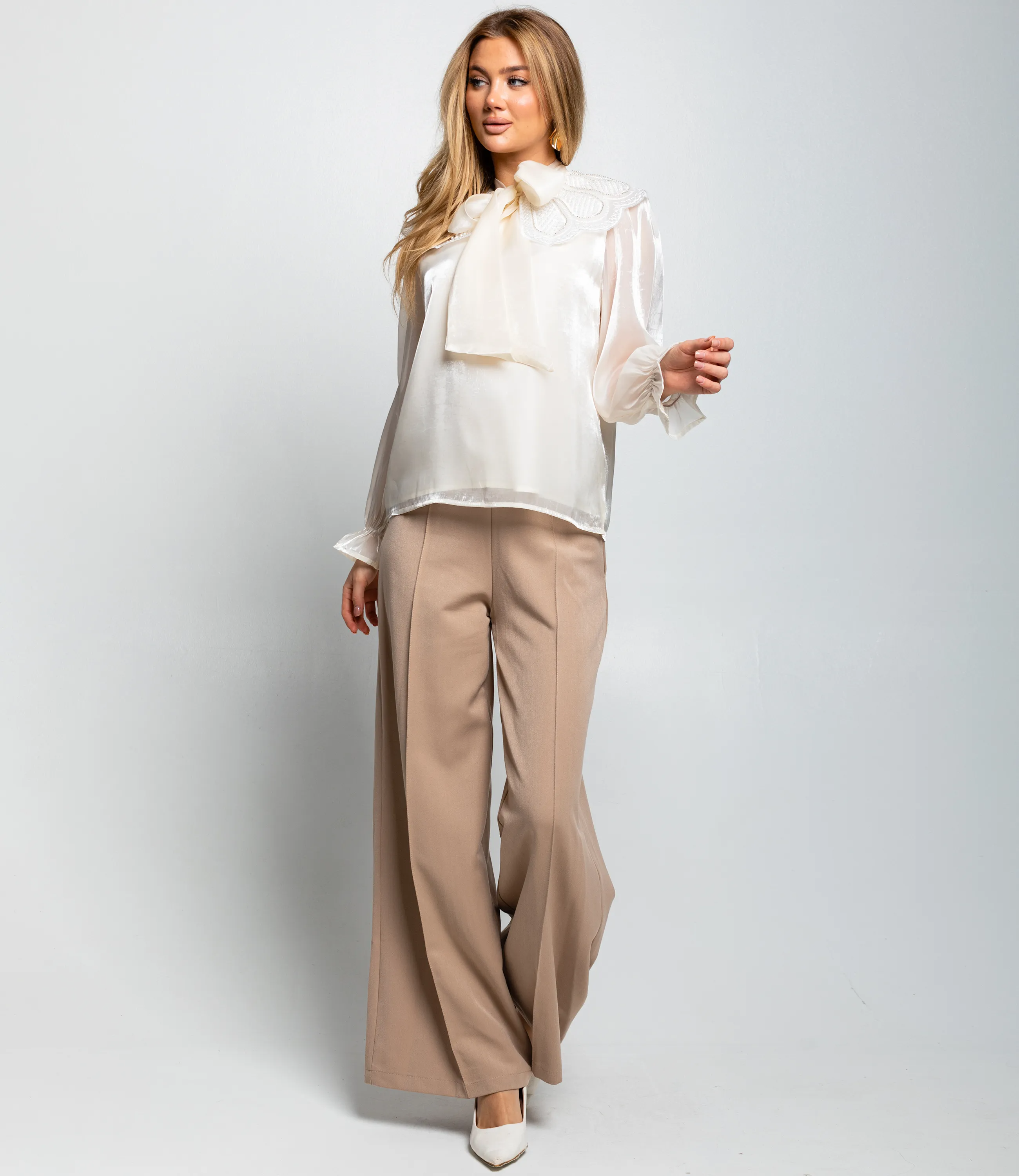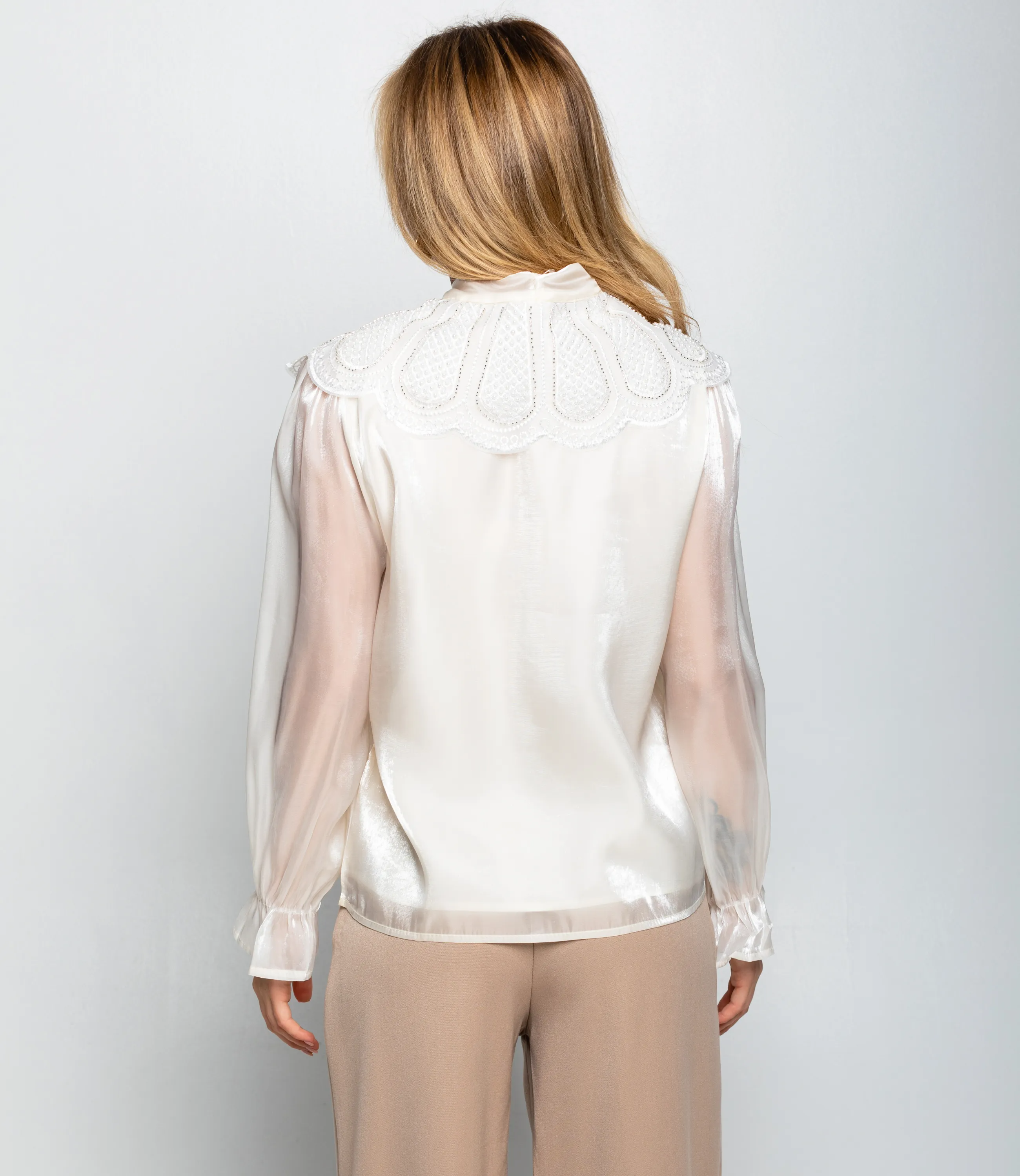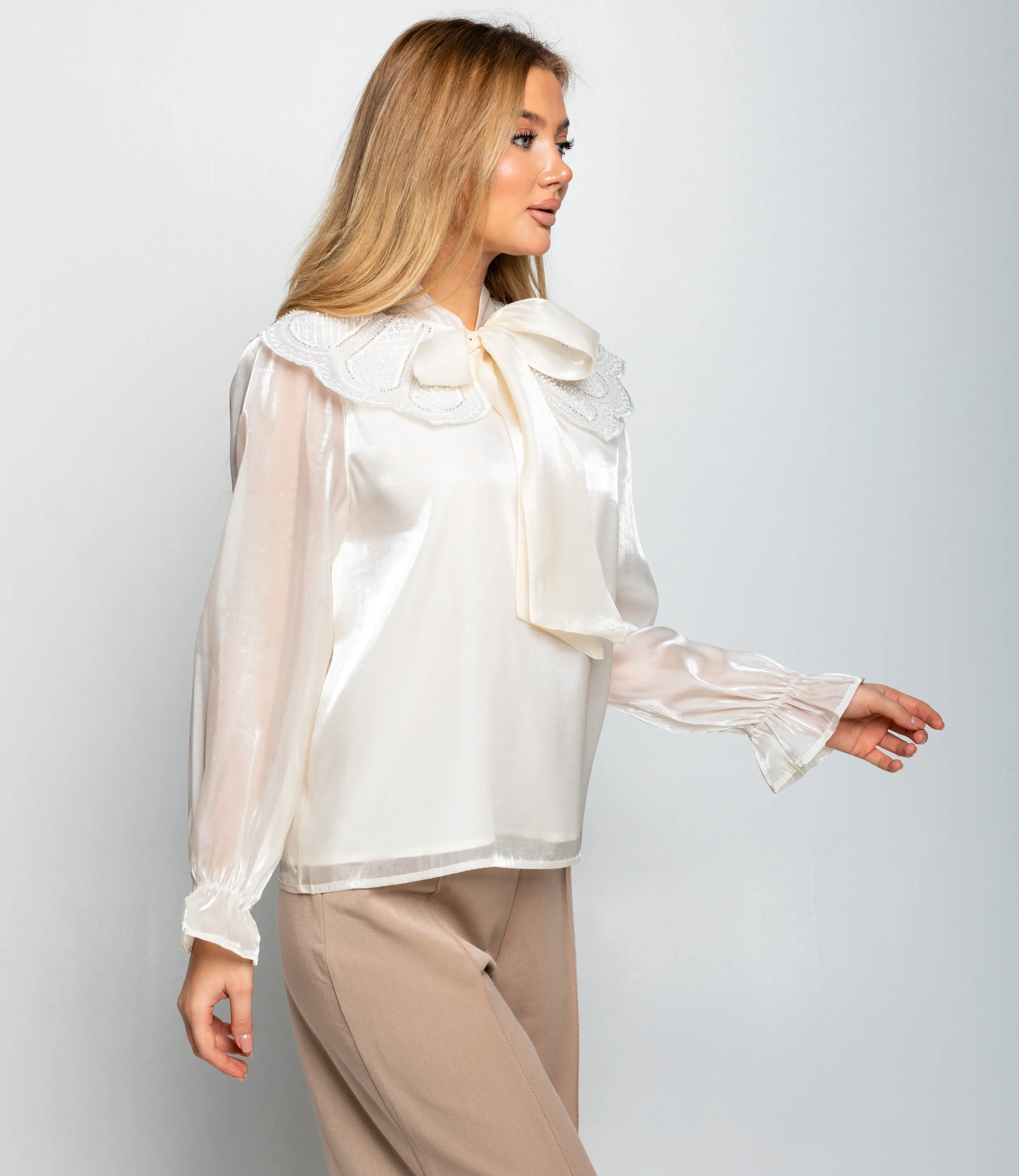 Эта Блуза — идеальный выбор для вашего магазина, предлагающий стильный и универсальный элемент гардероба для весеннего сезона. Лёгкая блуза прямого силуэта длиной до бёдер выполнена из тонкой полупрозрачной ткани с мягким блеском и плавным драпированием; широкий плоский воротник с волнообразным краем плавно переходит в длинные завязывающиеся ленты, образующие бантик на шее; длинные рукава имеют небольшой объём в верхней части и заканчиваются узкими присборенными манжетами с тонкой оборкой; воротник украшен деликатной отделочной строчкой или вышивкой вдоль края. Ткань из 100% полиэстера является качественной и приятной на ощупь, а свободный крой обеспечивает комфорт при носке, позволяя чувствовать себя уверенно в течение всего дня. Эта Блуза станет универсальным элементом гардероба, который легко сочетать как с брюками для создания делового образа, так и с джинсами для более повседневного и расслабленного стиля. На странице сайта доступна таблица размеров, что поможет вашим покупателям быстро найти идеальный вариант. Предложенная цена делает ее доступной для широкой аудитории, что повышает интерес к этой модели.