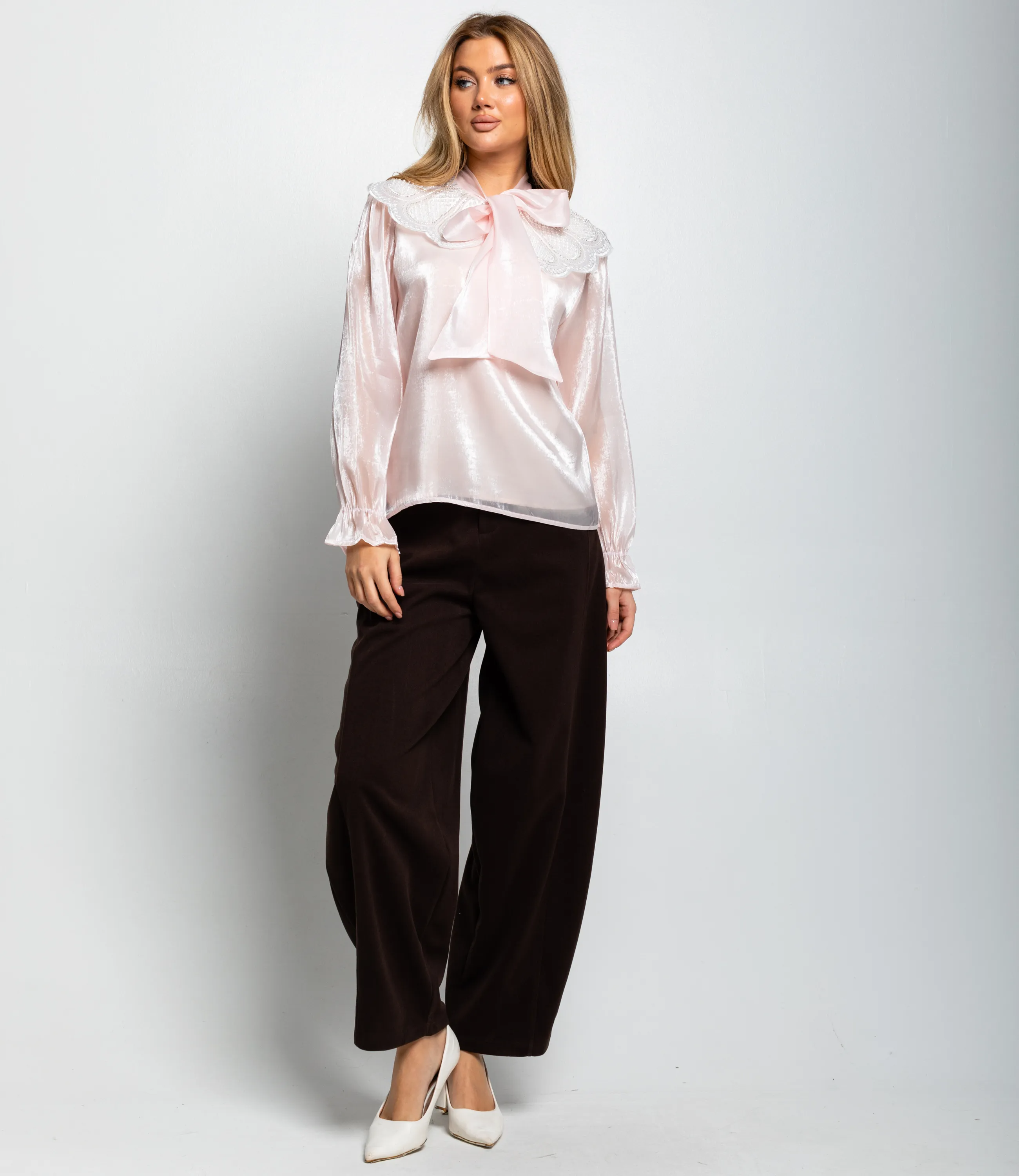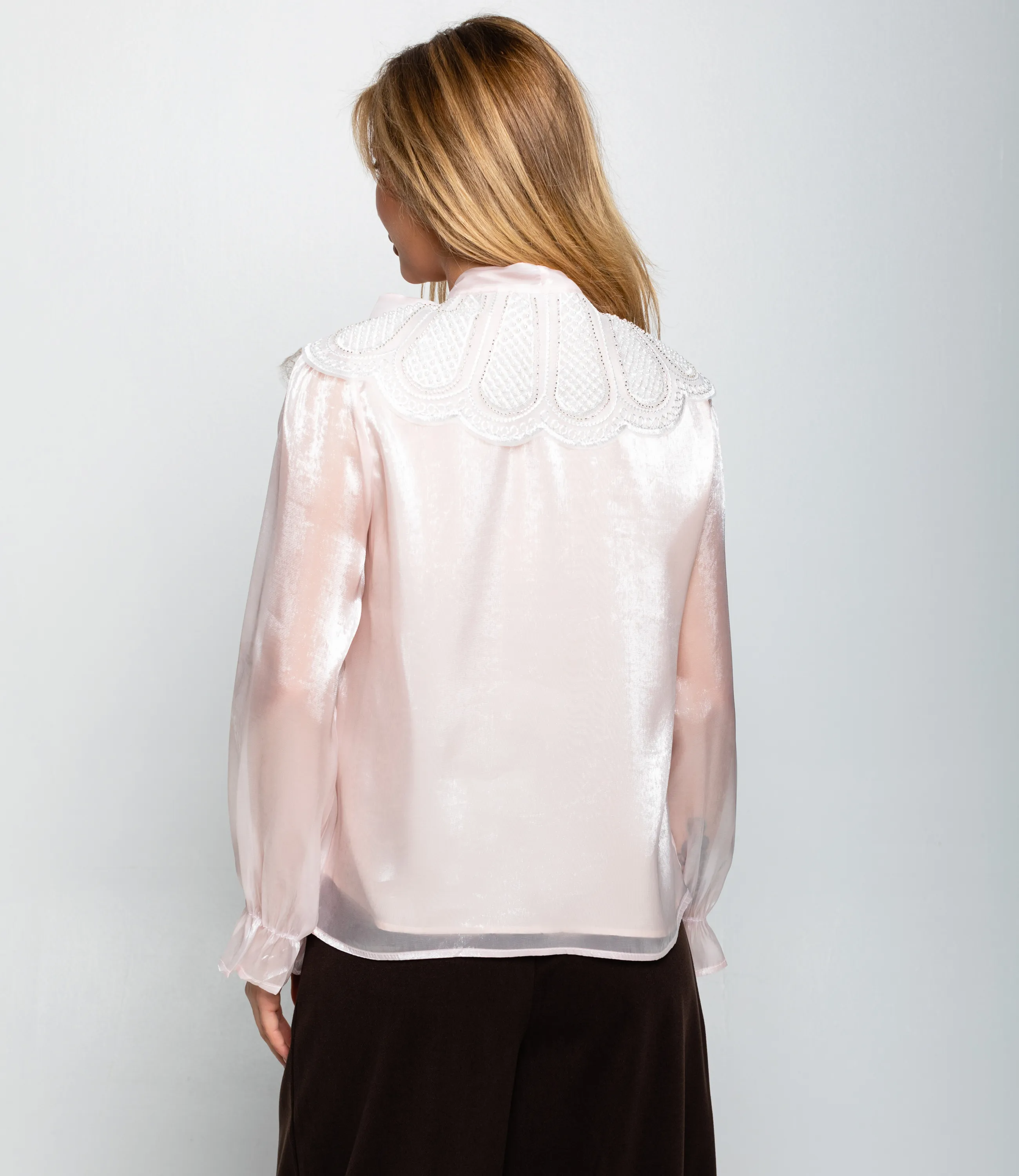Эта Блуза — идеальный выбор для вашего магазина, предлагающий стильный и универсальный элемент гардероба для весеннего сезона. Лёгкая блуза прямого силуэта длиной до бёдер выполнена из тонкой полупрозрачной ткани с мягким блеском и плавным драпированием; широкий плоский воротник с волнообразным краем плавно переходит в длинные завязывающиеся ленты, образующие бантик на шее; длинные рукава имеют небольшой объём в верхней части и заканчиваются узкими присборенными манжетами с тонкой оборкой; воротник украшен деликатной отделочной строчкой или вышивкой вдоль края. Ткань из 100% полиэстера является качественной и приятной на ощупь, а свободный крой обеспечивает комфорт при носке, позволяя чувствовать себя уверенно в течение всего дня. Эта Блуза станет универсальным элементом гардероба, который легко сочетать как с брюками для создания делового образа, так и с джинсами для более повседневного и расслабленного стиля. На странице сайта доступна таблица размеров, что поможет вашим покупателям быстро найти идеальный вариант. Предложенная цена делает ее доступной для широкой аудитории, что повышает интерес к этой модели.