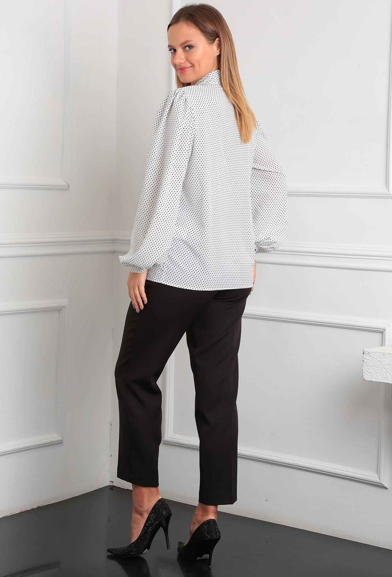 Модель: Леди Лайн 524 белый горох ..показать>Рост: 164 см (девушка на фото ростом 170см) Сезон: Круглогодичный Тип ткани: Полиэфир 49 %, Вискоза 48%, Спандекс - 3%Блузка свободного прямого силуэта. По переду застёжка на петли и пуговицы. Воротник оложной с завязками в бант Рукав свободный. По окату и низу на сборкек. По низу рукава пришит манжет и застёгивается манжет на одну петлю и пуговицу.