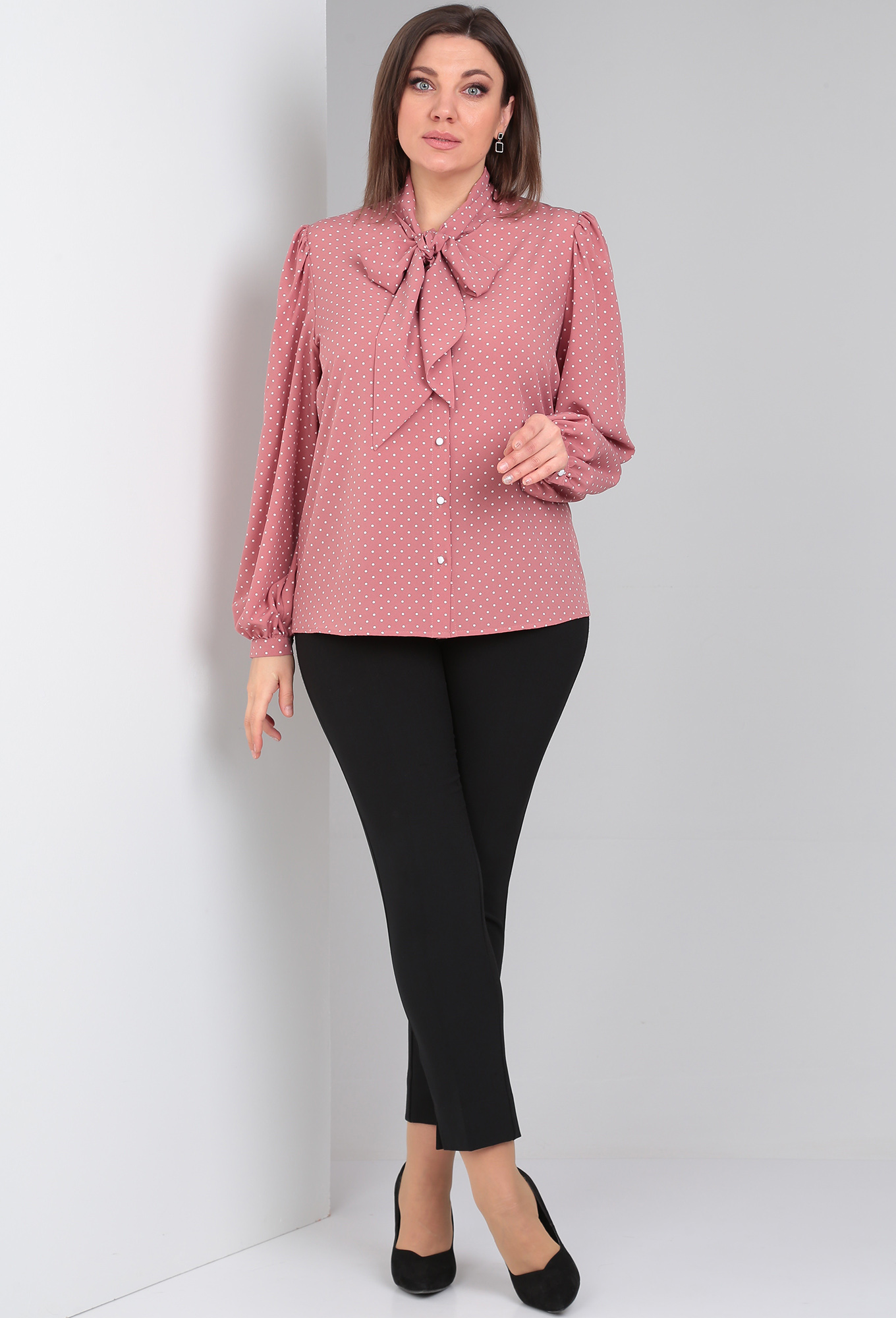 Модель: Леди Лайн 524 розовый горох <..показатьli>Рост: 164 см (девушка на фото ростом 170см) Сезон: Круглогодичный Тип ткани: Полиэфир 49 %, Вискоза 48%, Спандекс - 3%Блузка свободного прямого силуэта. По переду застёжка на петли и пуговицы. Воротник оложной с завязками в бант Рукав свободный. По окату и низу на сборкек. По низу рукава пришит манжет и застёгивается манжет на одну петлю и пуговицу.