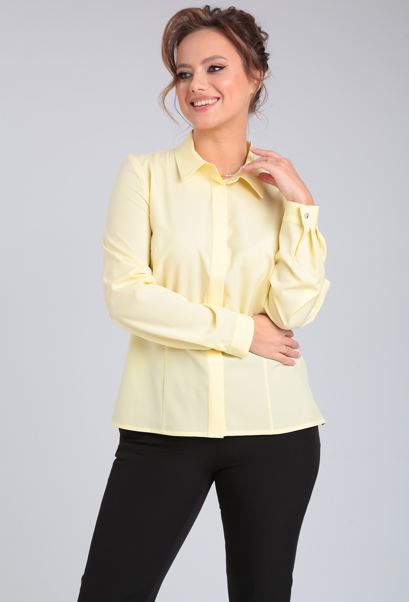 Модель: Леди Лайн 540 желтый Рост..показать: 164 см (девушка на фото ростом 170см) Сезон: Круглогодичный Тип ткани: Полиэфир 49 %, Вискоза 48 %, Спандекс 3 %Блузка элегантная прямого силуэта, из приятной к телу ткани софт, дышащая. Воротник на стойке По переду планка с потайной застёжкой на петли и пуговицы. По спинке застрочены вытачки. Низ блузки прямой. По боковым швам раз- резы. Рукав втачной . По низу рукава заложены складки и пришит манжет, который застёгивается на петли и пуговицы.