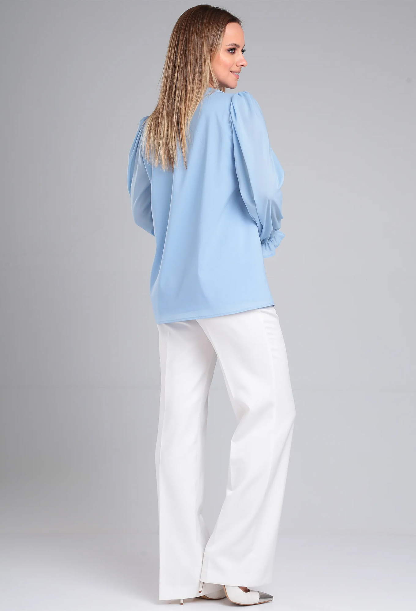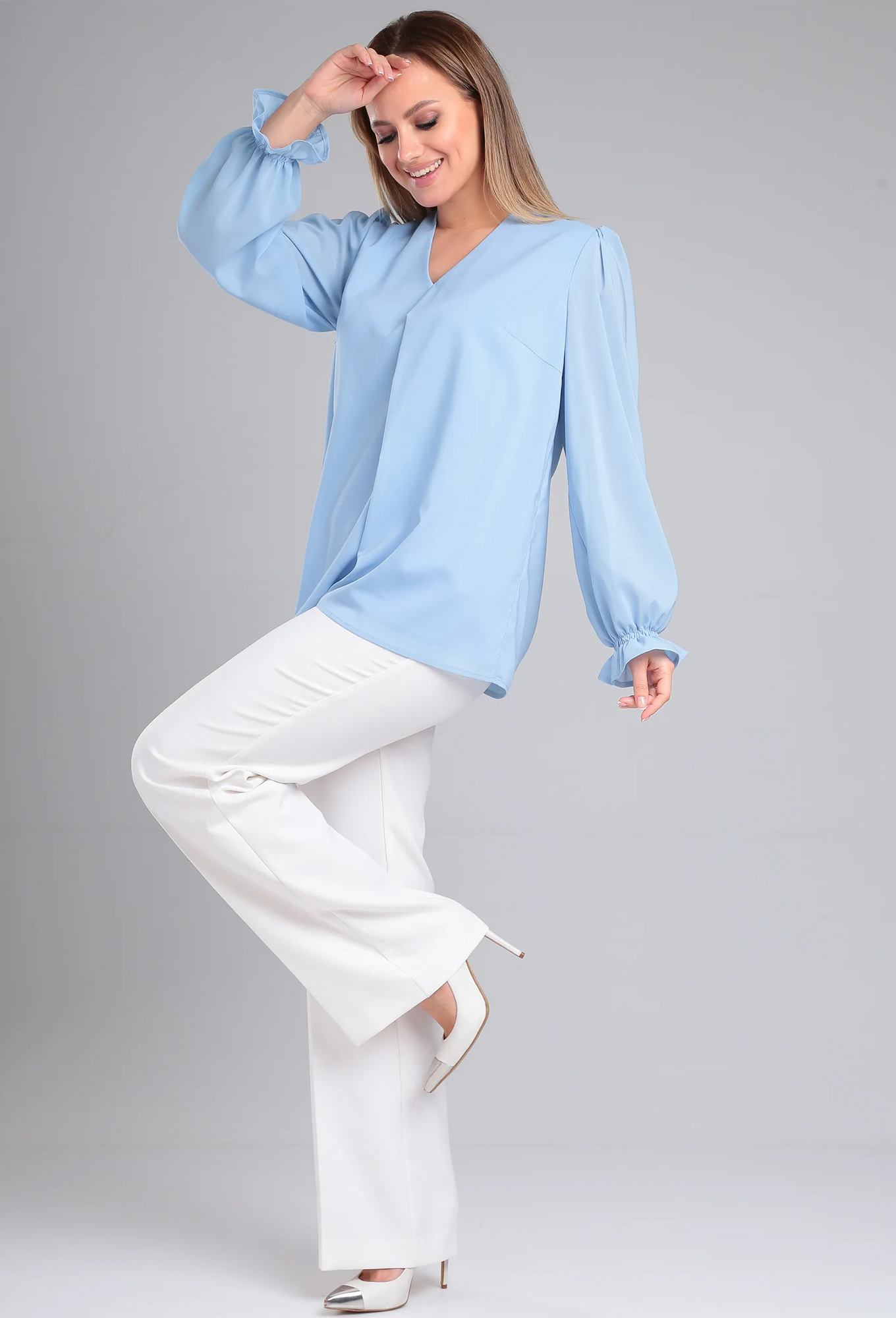 Вырез горловины V - ОБРАЗНЫЙ По центру горловины заложена мягкая односторонняя складка глубиной 2,5см. По переду две нагрудные вытачки. Рукав длинный. По окату рукава выполнена сборка, по низу рукав обработан в чистый _x000D_