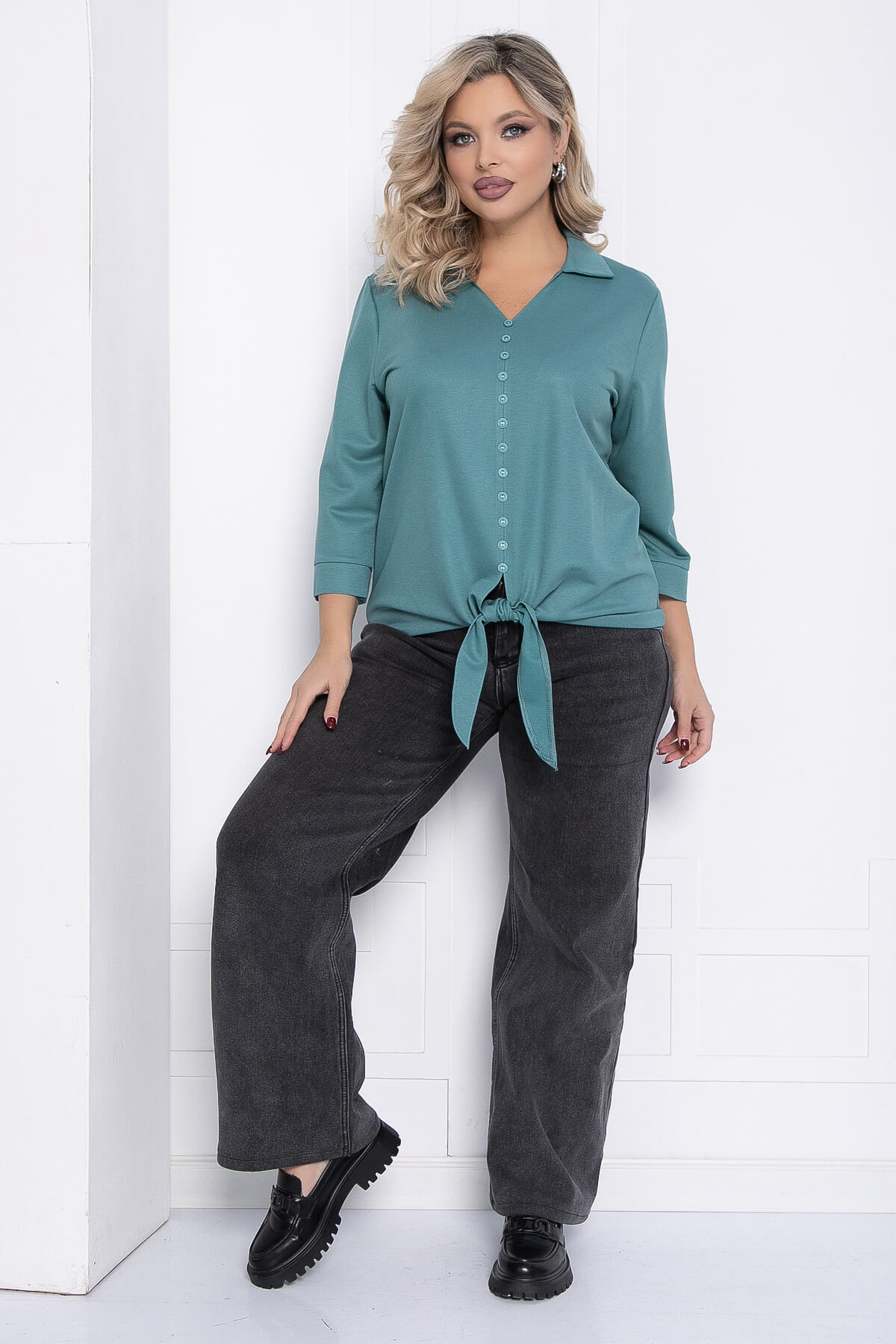 Изящная блузка станет вашим незаменимым элементом гардероба. Блузка имеет прямой крой и украшена декоративной завязкой по низу на передней части, что придаёт ей особый шарм. Рукава средней длины заканчиваются аккуратными манжетами, а воротник рубашечного типа добавляет классический акцент. На передней части блузки располагается декоративный элемент в виде пуговок, подобранных в тон ткани. Этот штрих придаёт изделию нотку утончённости.
