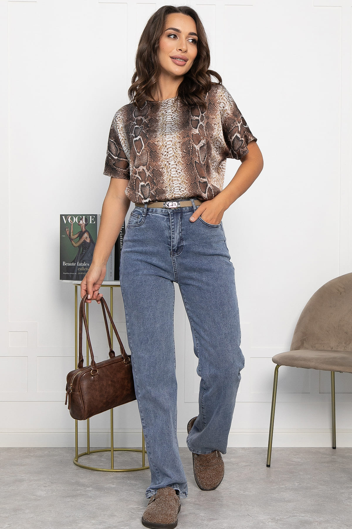 Выделитесь из толпы с нашей изысканной женской блузкой с изящным принтом рептилии. Эта модель станет отличным выбором для создания стильных и запоминающихся образов. Свободный крой, цельнокроеные рукава и округлый вырез обеспечивают комфорт и свободу движений. Принт рептилии привлекает внимание и добавляет образу очарования. По бокам блузки предусмотрены разрезы, а передняя часть короче задней.