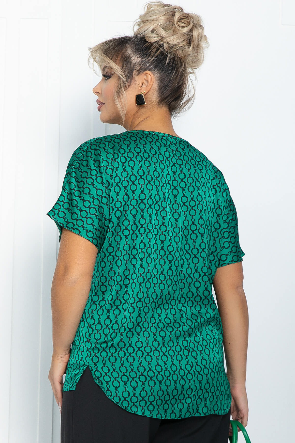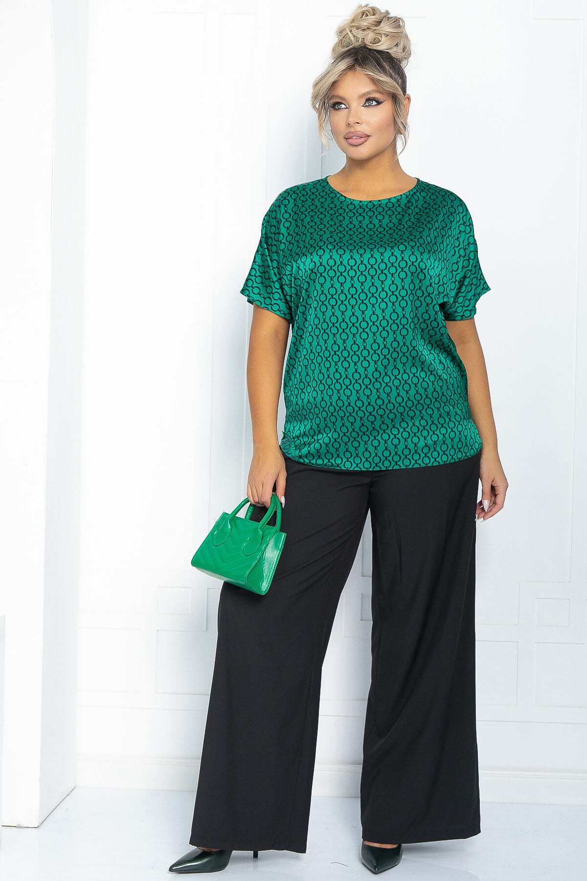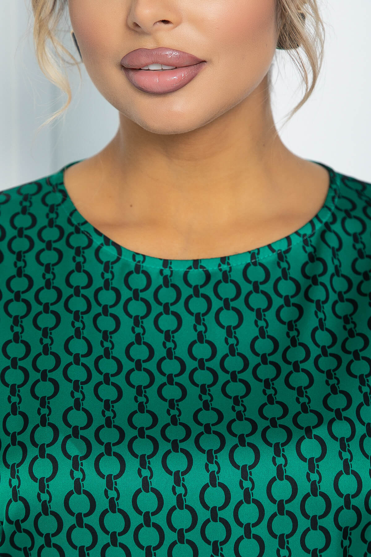 Блузка насыщенного зеленого цвета с принтом станет отличным дополнением в вашем гардеробе! Её легко сочетать с брюками, джинсами или юбкой. Также можно надеть под пиджак или жакет. Модель свободного кроя с цельнокроеным рукавом и округлым вырезом. Она подходит для повседневных образов и для домашнего использования. Благодаря своему свободному крою она обеспечит комфорт и свободу движения. Длина переда короче.