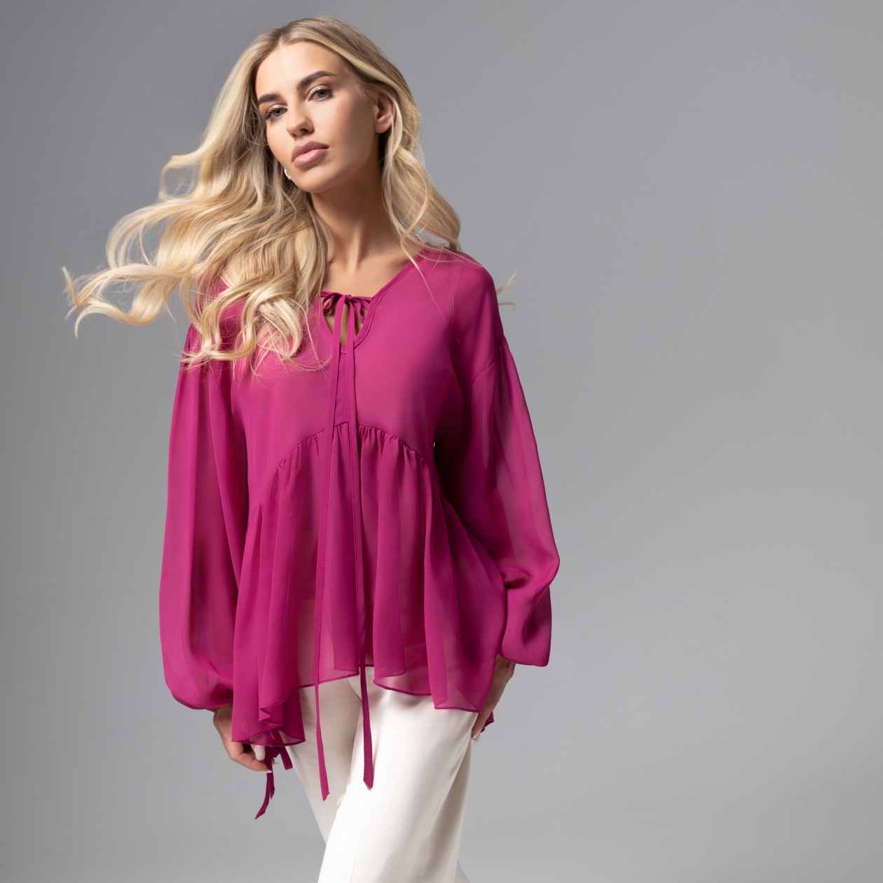 Джейн Биркин на улицах Парижа можно было встретить в расклешенных блузах. Поклонница стиля бохо, она не боялась цвета и чужых взглядов. В блузе из коллекции PREMIUM вы будете символом завидной модной раскрепощенности. Блуза свободна кроя. Изделие хорошо смотрится на любом типе фигуры. Зона декольте, зона спинки и рукава оформлены тонкими завязками.
