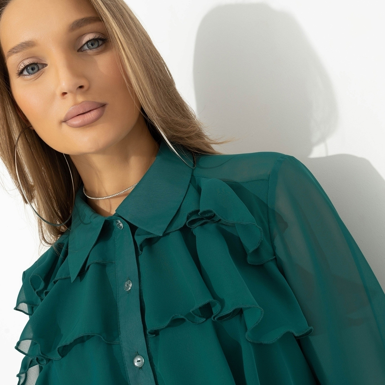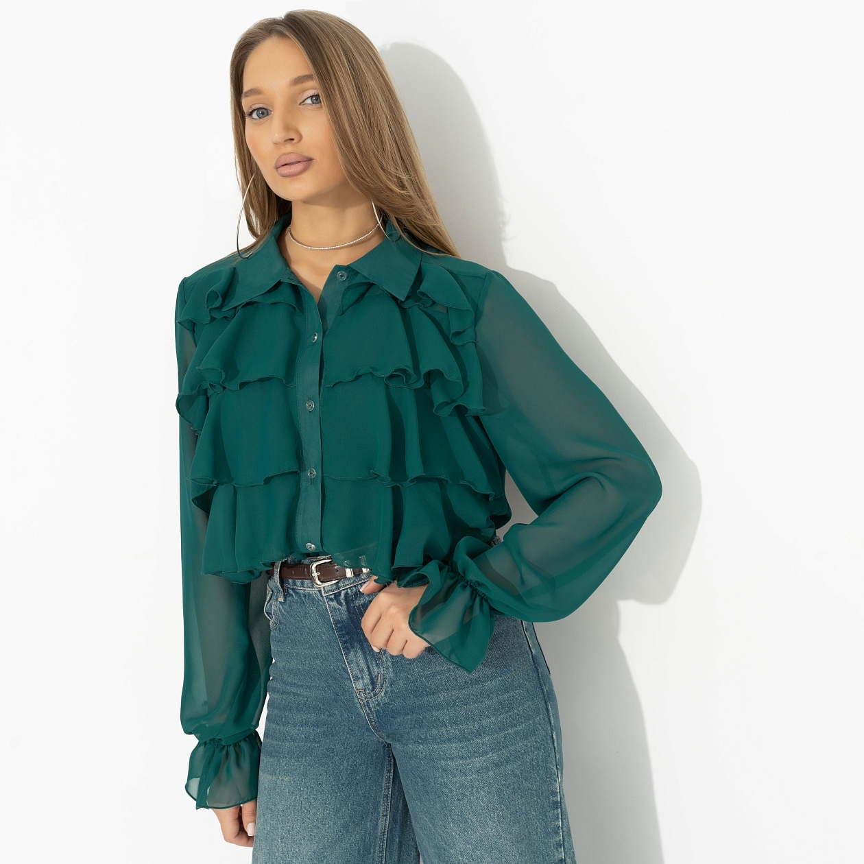 Когда благородство изумруда встречает нежность воланов – появляется эта блуза! Для тех, кто любит быть в центре внимания, но без лишних слов. Добавляем в корзину. Блуза свободного силуэта. Передняя часть изделия дополнена рюшами. Рукава на тонкой резинке. Ткань слегка просвечивает. Блуза застегивается на пуговицы по передней части. Изделие хорошо смотрится навыпуск и в заправленном виде.