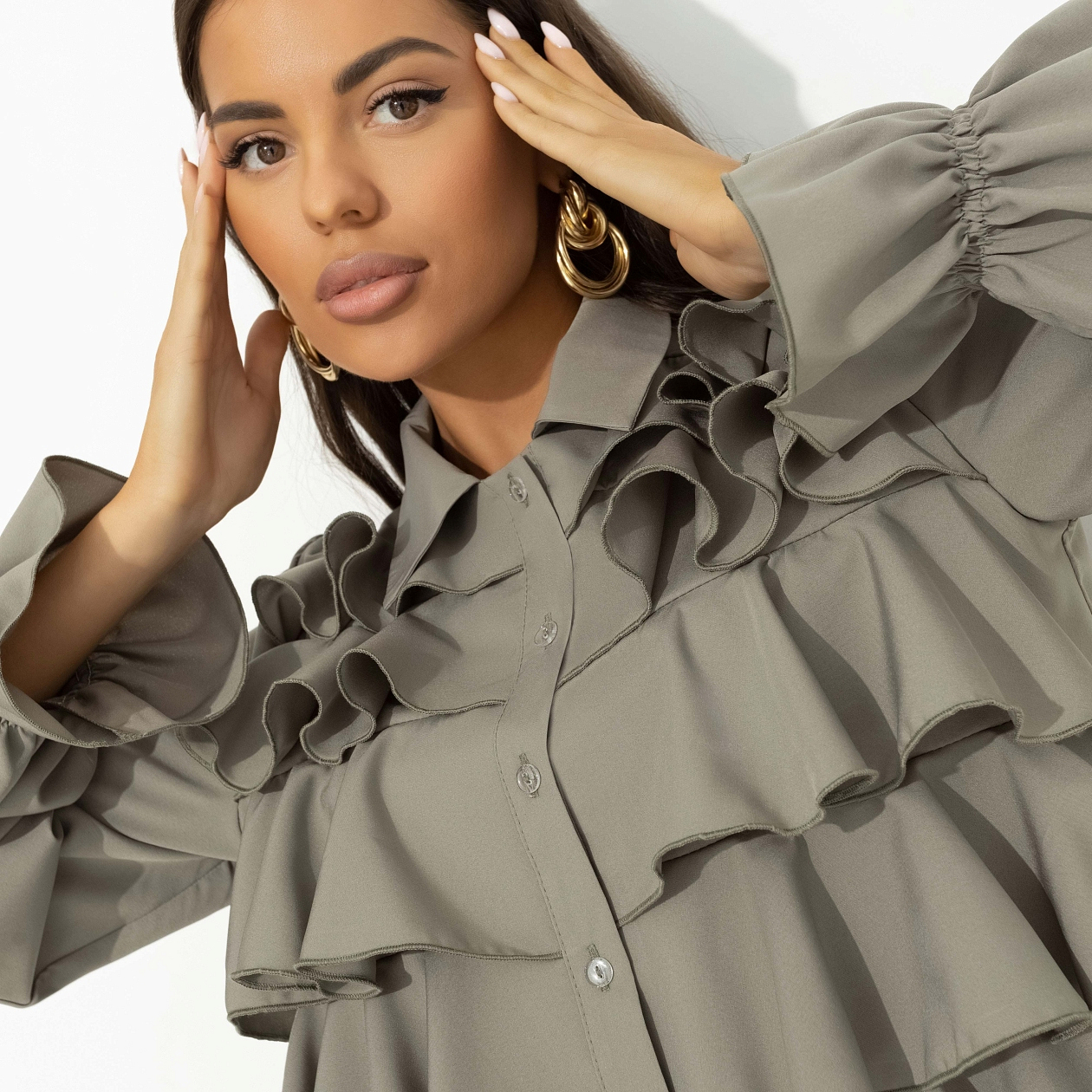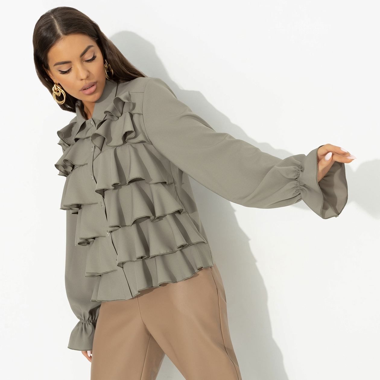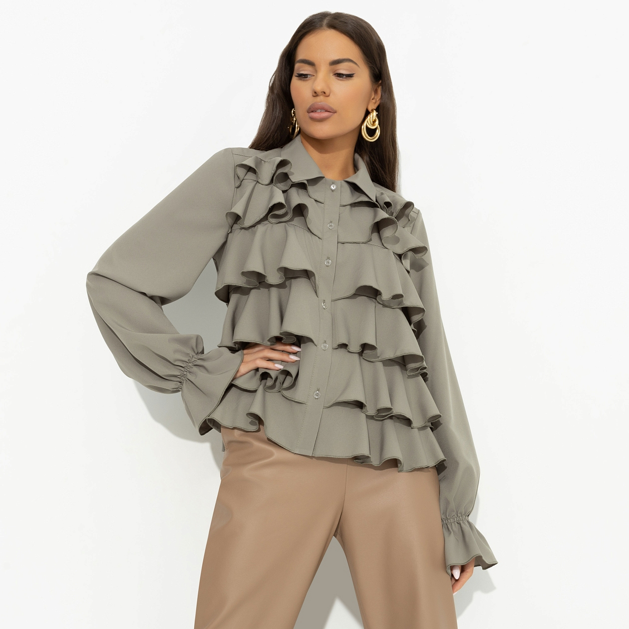 Эта нарядная блуза «Гипнотический стиль» из ткани «Ниагара» создана для женщин, которые хотят подчеркнуть свою индивидуальность и элегантность. Легкая и воздушная, она словно создана для того, чтобы вы чувствовали себя уверенно в любой ситуации. Женская блуза с длинным рукавом и рюшами по передней стороне изделия — это не просто одежда, это способ выразить свою уникальность. Тонкая резинка на рукавах добавляет изысканности, а пуговицы придают образу завершенность. Купив эту блузу оптом, вы обеспечите себя стильными образами на каждый день.