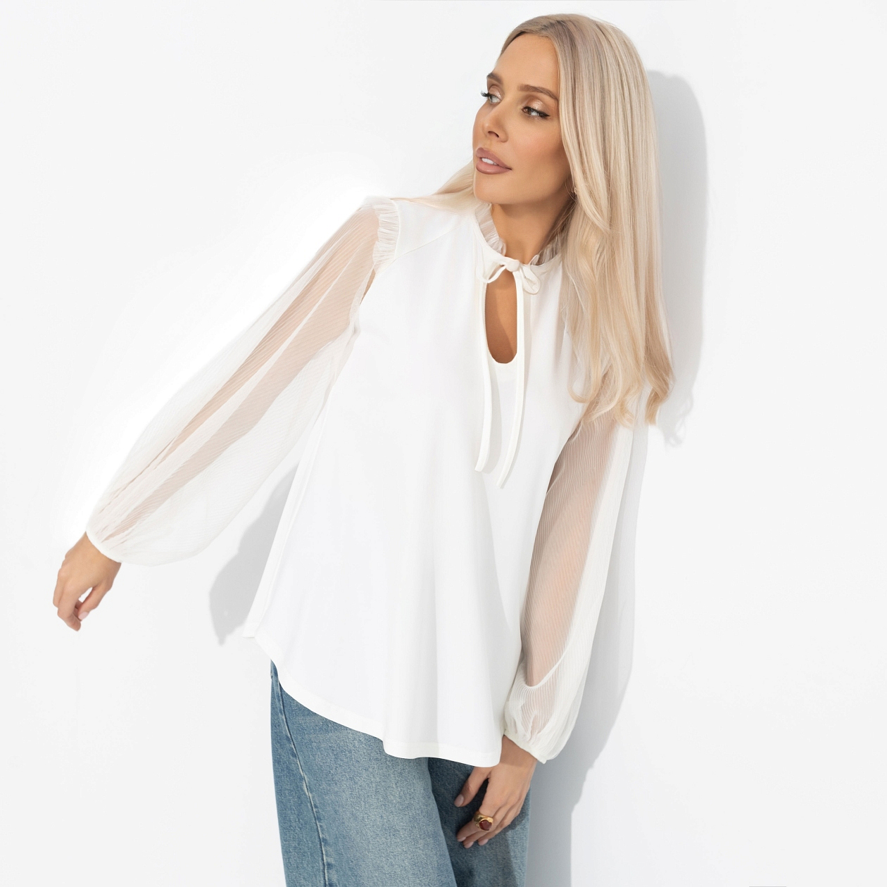 Ты в блузе ЧАРУТТИ лишь на первый взгляд воплощение невинности. На самом деле в тебе скрывается стальная воля. Её воздушность и мягкие складки говорят о чистоте намерений, но безупречный крой и уверенные линии выдают внутреннюю силу. Ты четко даешь понять: доброта не означает слабости. Блуза удлиненная прямого силуэта. Рукава выполнены из сетчатого материала. Ворот дополнен деликатной сборкой, есть завязки. Изделие хорошо смотрится в заправленном виде и навыпуск.