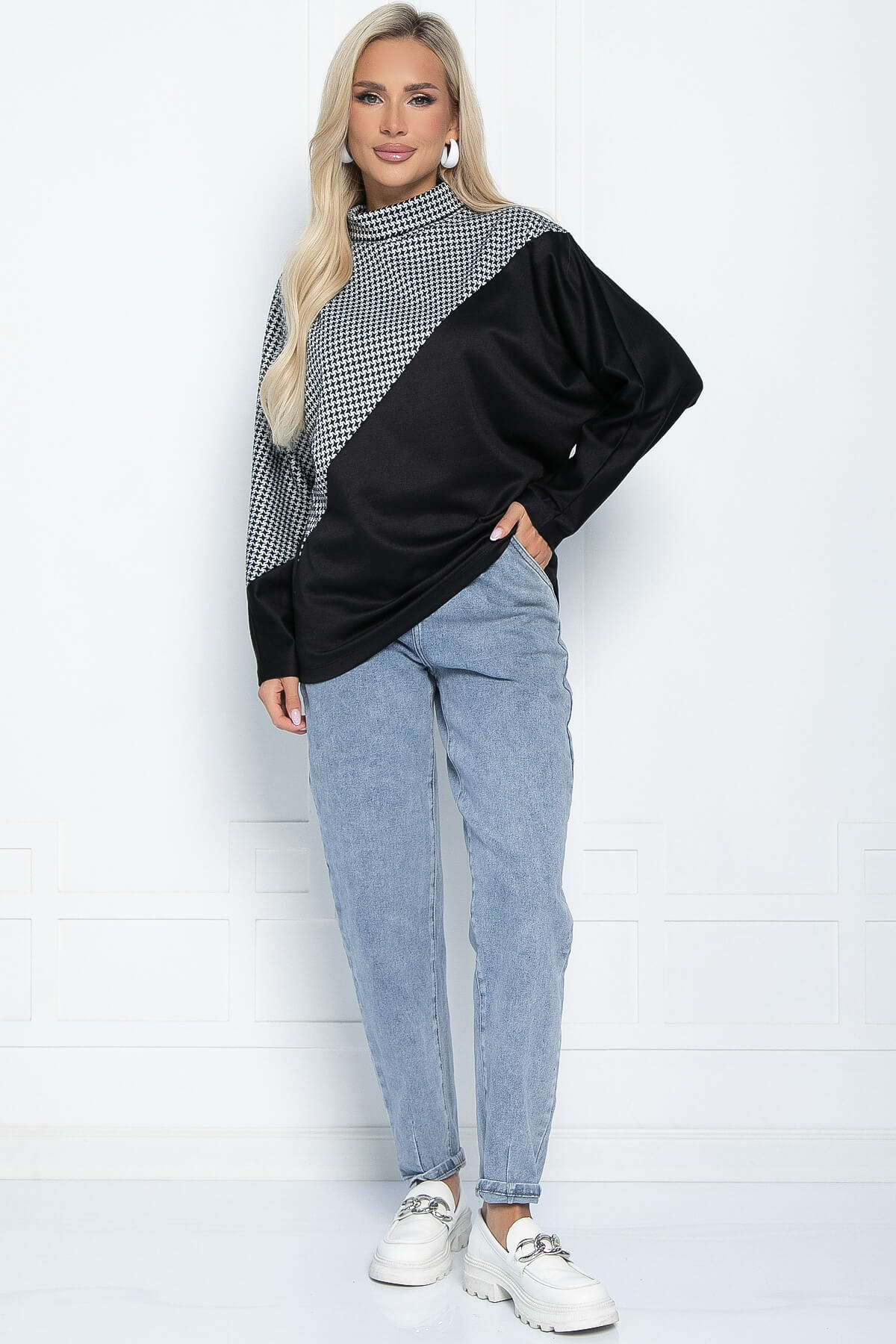 Стильный джемпер ассиметричного кроя и с принтом "гусиная лапка" гармонично украсит любой образ. Джемпер имеет высокую стойку-воротник, что позволяет менять форму воротника, рукава скроены по типу "летучая мышь". Свободный крой позволяет скрыть недостатки фигуры. Такой джемпер отлично будет смотреться, как с брюками, так и с юбкой.