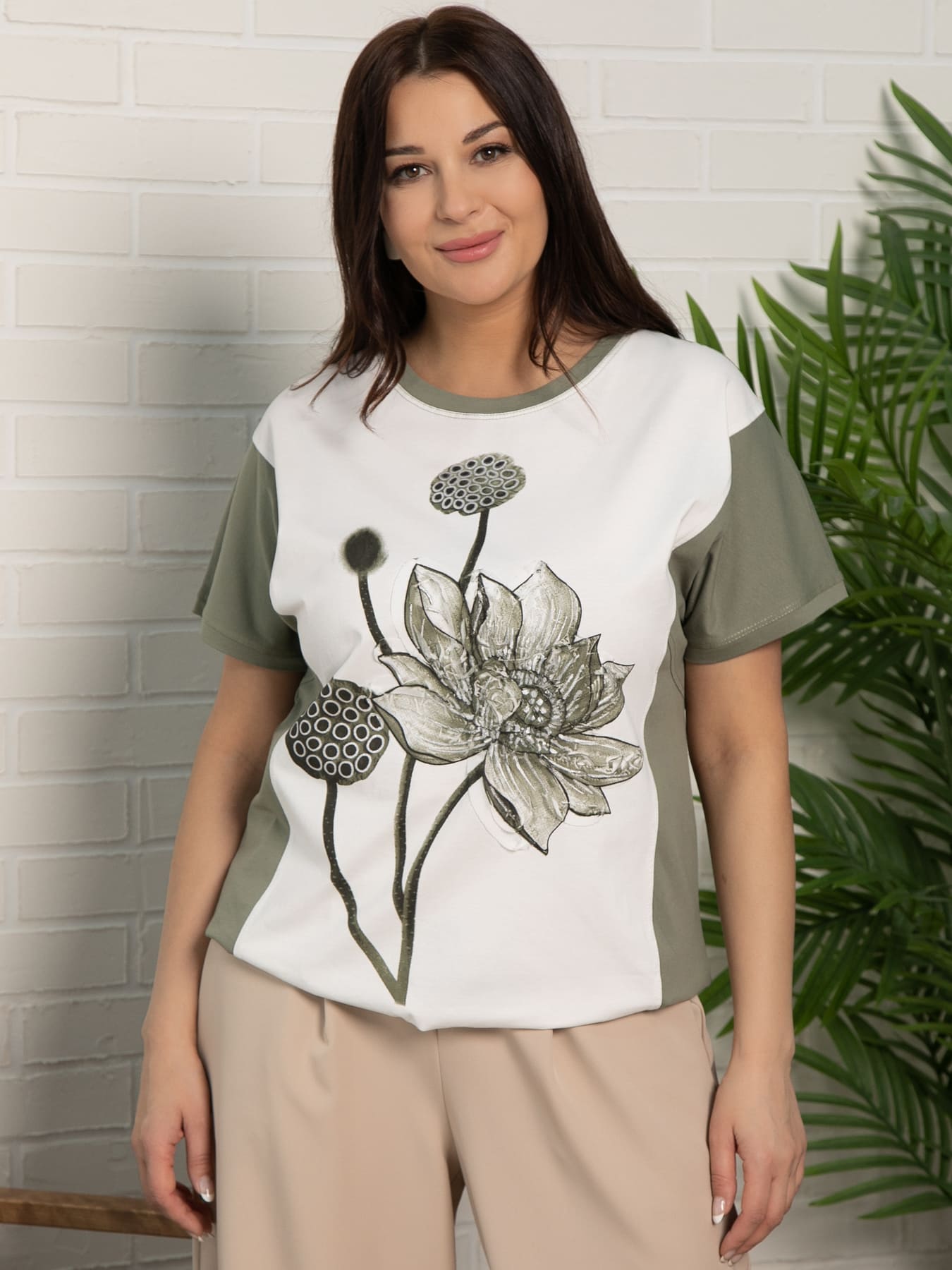 Стильная блуза прямого кроя в бело-зеленом цвете, идеально сочетающая два оттенка хлопковой ткани для создания свежего и яркого образа. Основной акцент — объемный цветок, расположенный по центру, выполненный в двух техниках: яркая объемная фотопечать и декоративная нашивка лентой, что придает изделию особую выразительность и привлекает внимание к деталям. Округлая горловина и короткий рукав создают легкий и комфортный силуэт. По низу блузы расположена затяжка на шнурке, что позволяет регулировать посадку и добавляет стильный акцент. Отличный выбор для тех, кто любит сочетать оригинальность с классикой.