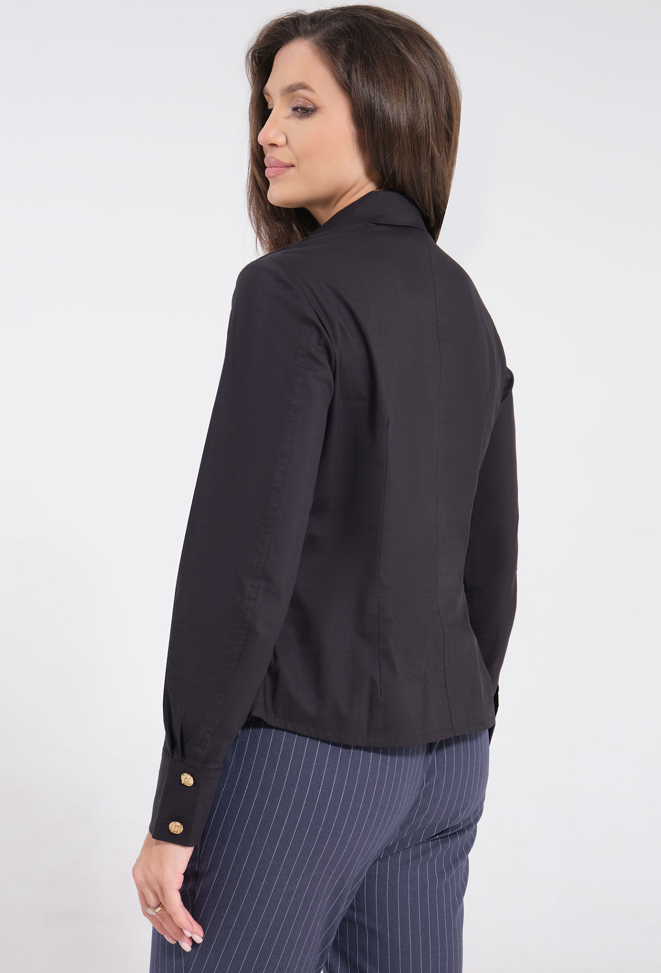 Модель: Панда 117740 черный Рост:..показать 164 см (девушка на фото ростом 164см) Сезон: Круглогодичный Тип ткани: Хлопок 76%, полиэстер 22%, эластан 2%.Блузка с длинным рукавом - это классика. Силуэт приталенный. Базовая блузка без рисунка и карманов подойдет для холодного лета и теплой осени, зимы и весны. Блузка из хлопковой ткани с оригинальным воротником.