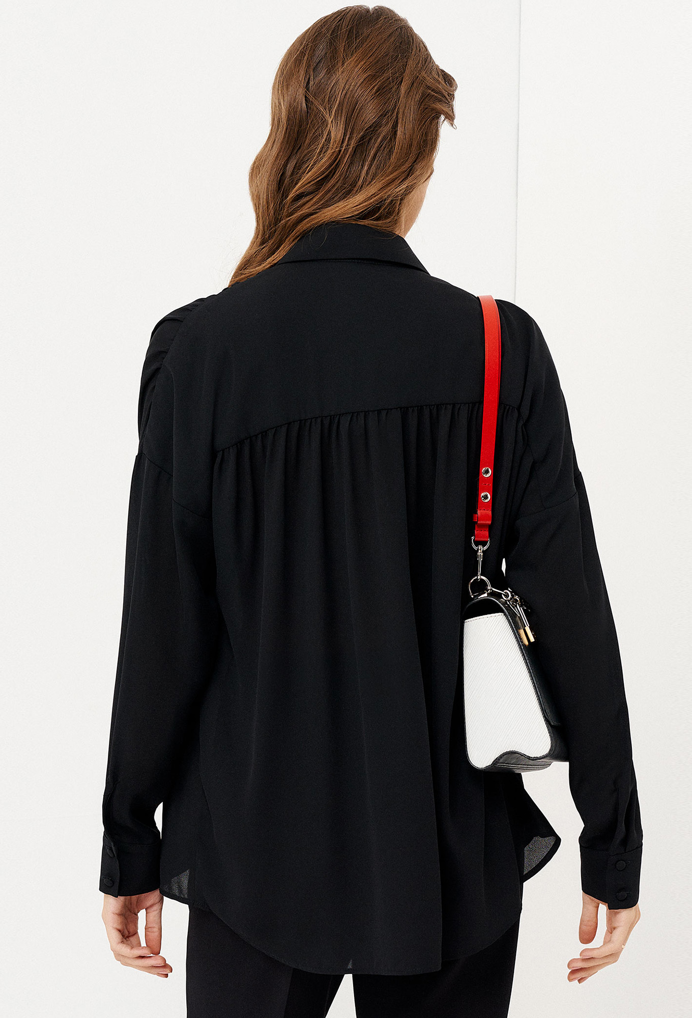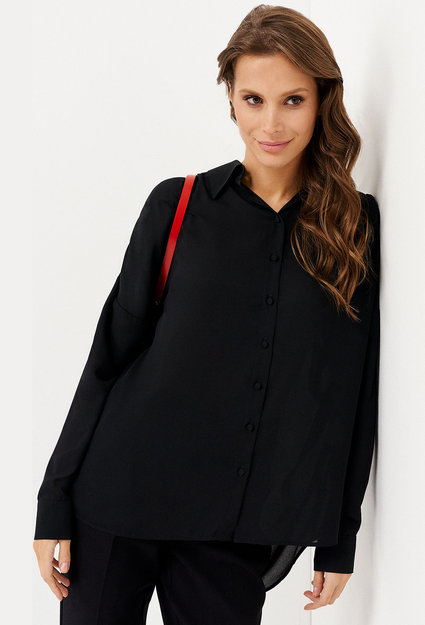 Модель: Панда 131940 черный Рост:..показать 164 см (девушка на фото ростом 164см) Сезон: Круглогодичный Тип ткани: Полиэстер 100%Блуза свободного кроя на пуговицах с длинным рукавом.