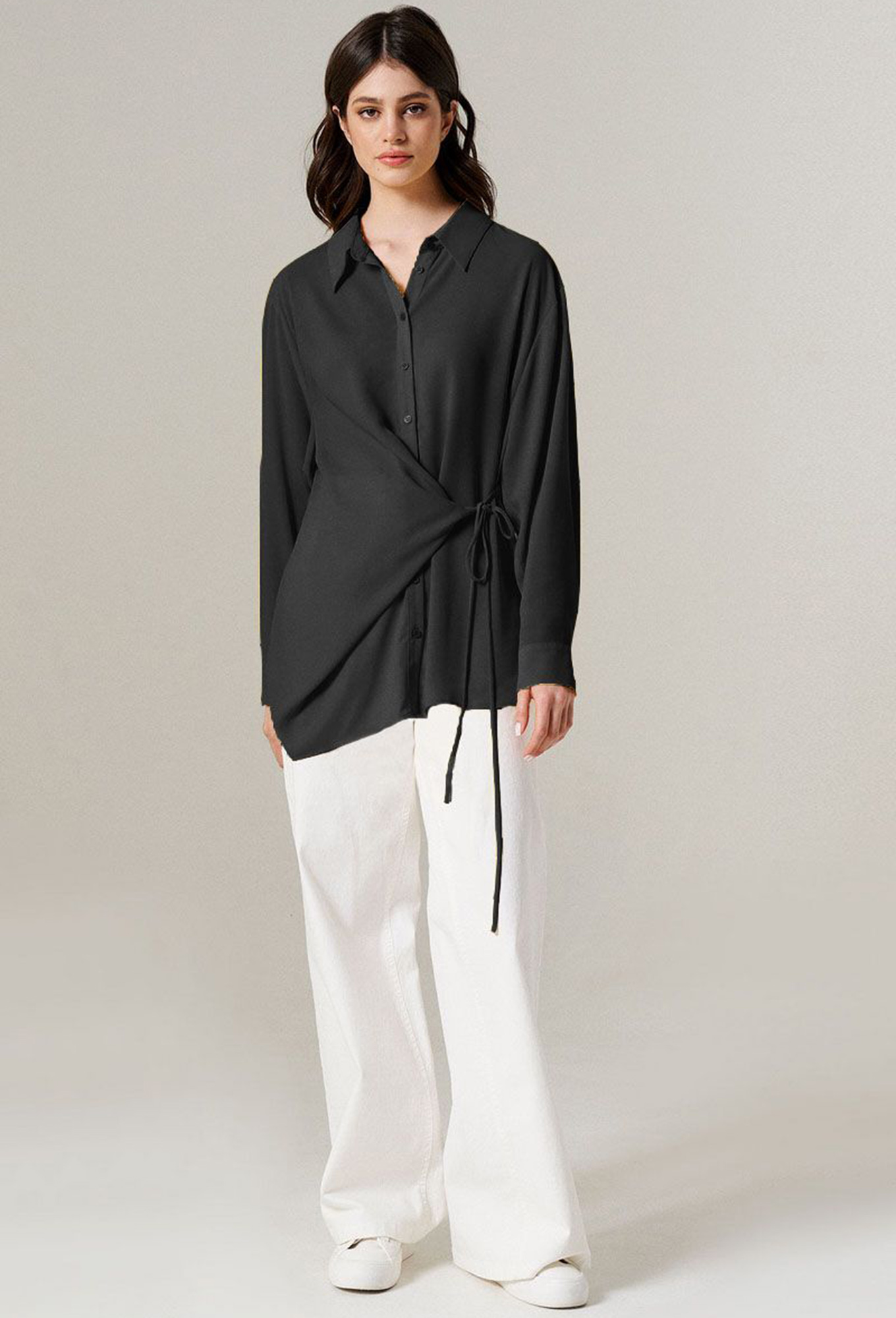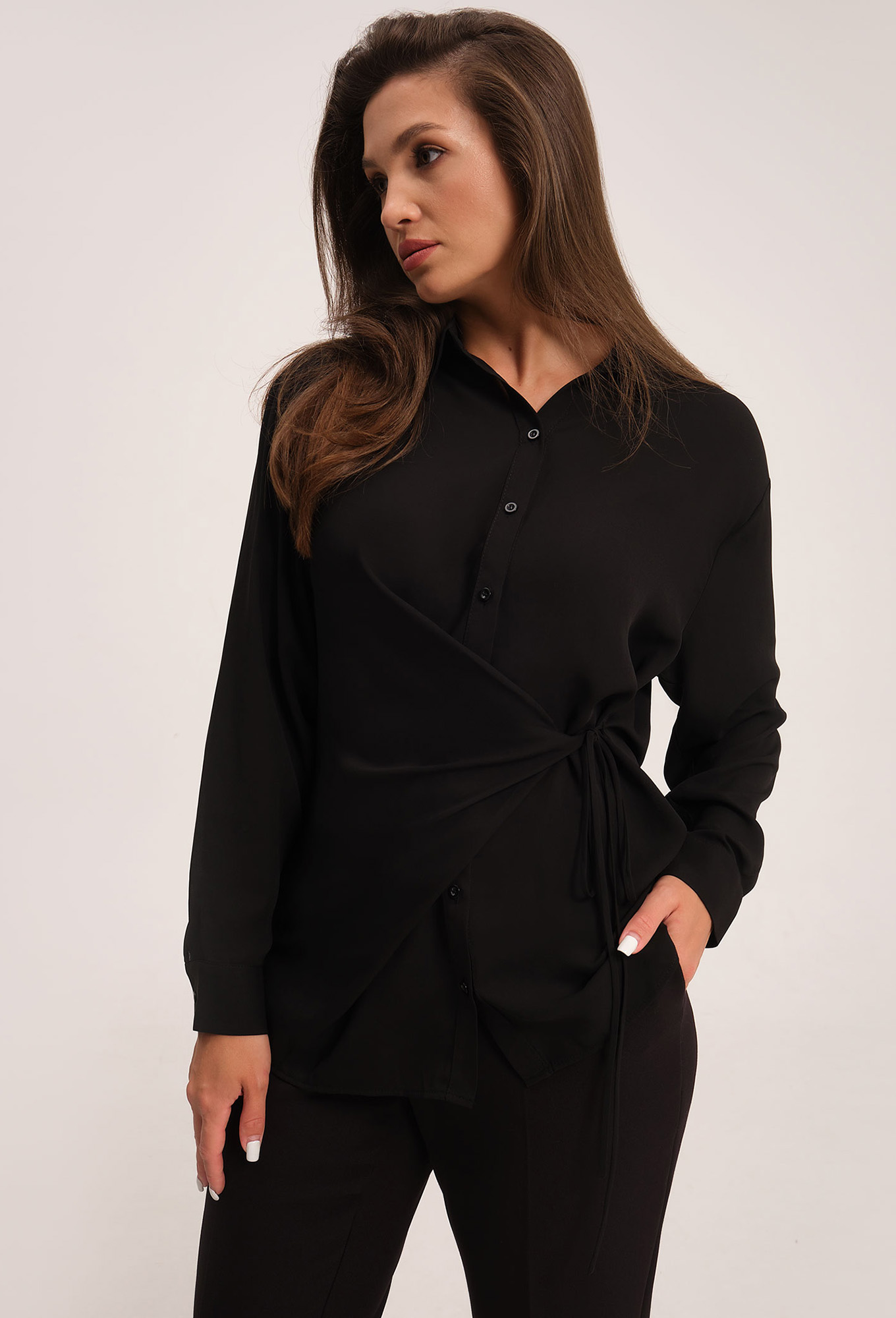 Модель: Панда 148040 черный Рост:..показать 164 см (девушка на фото ростом 164см) Сезон: Круглогодичный Тип ткани: Хлопок 66%, нейлон 28%, эластан 6%Удлиненная блузка-рубашка с узлом на талии.
