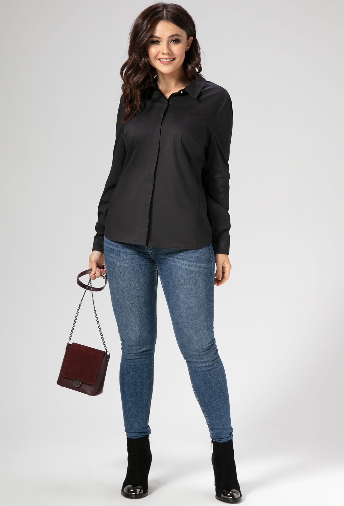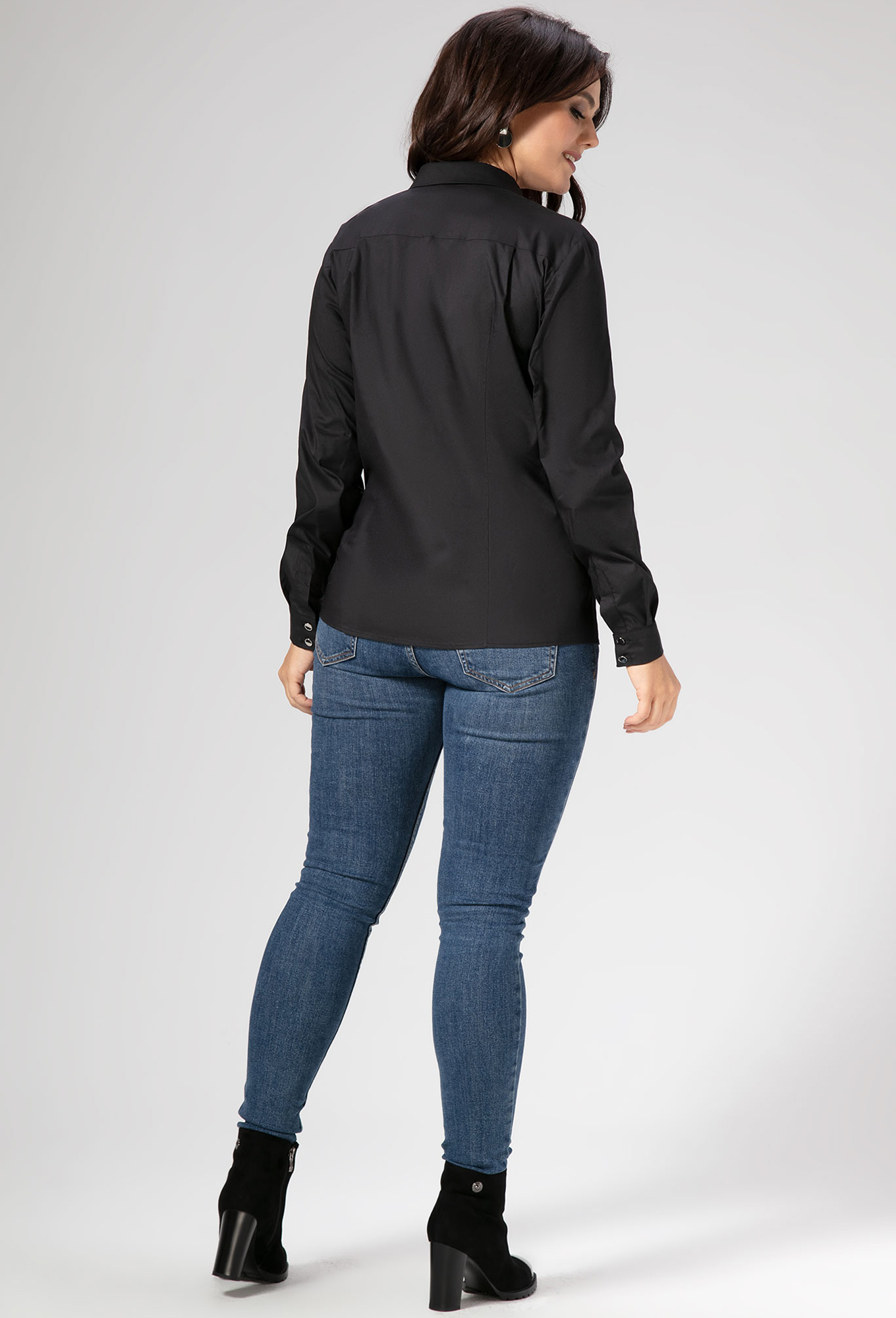 Модель: Панда 454440 черный Рост:..показать 164 см (девушка на фото ростом 164см) Сезон: Круглогодичный Тип ткани: Хлопок 76%, полиэстер 22%, эластан 2%Классическая блузка из хлопковой ткани. Блузка полуприлегающего силуэта, с центральной застежкой на потайные петли и пуговицы и одну петлю и пуговицу на воротнике. Спинка с горизонтальной кокеткой и двумя небольшими складочками. Рукава рубашечные одношовные с притачными манжетами, застегивающимися на петлю и пуговицу. По швам притачивания манжет закладываются односторонние складочки. Разрезы рукавов обработаны английской планкой. Воротник сорочечный, с притачной стойкой.